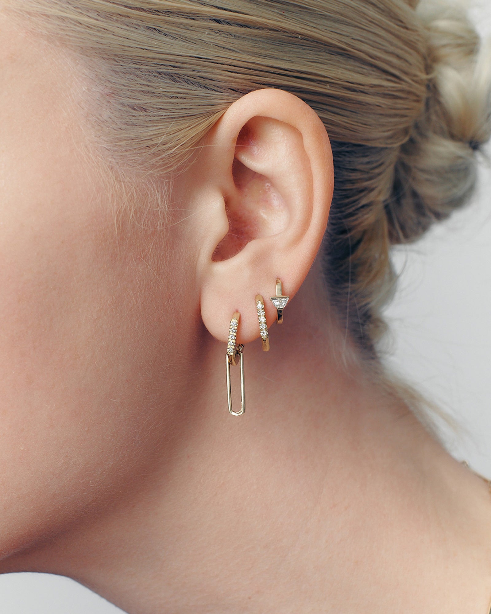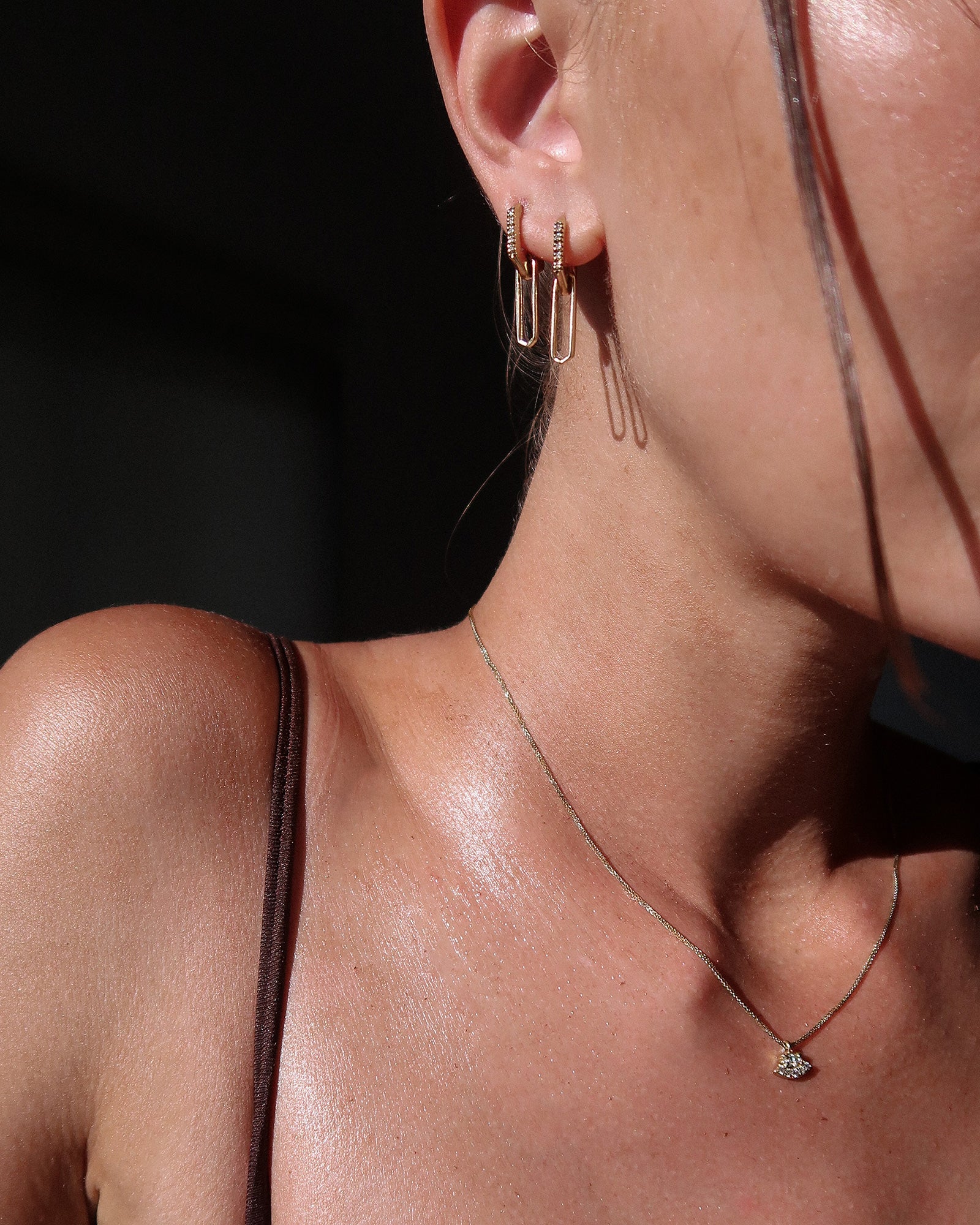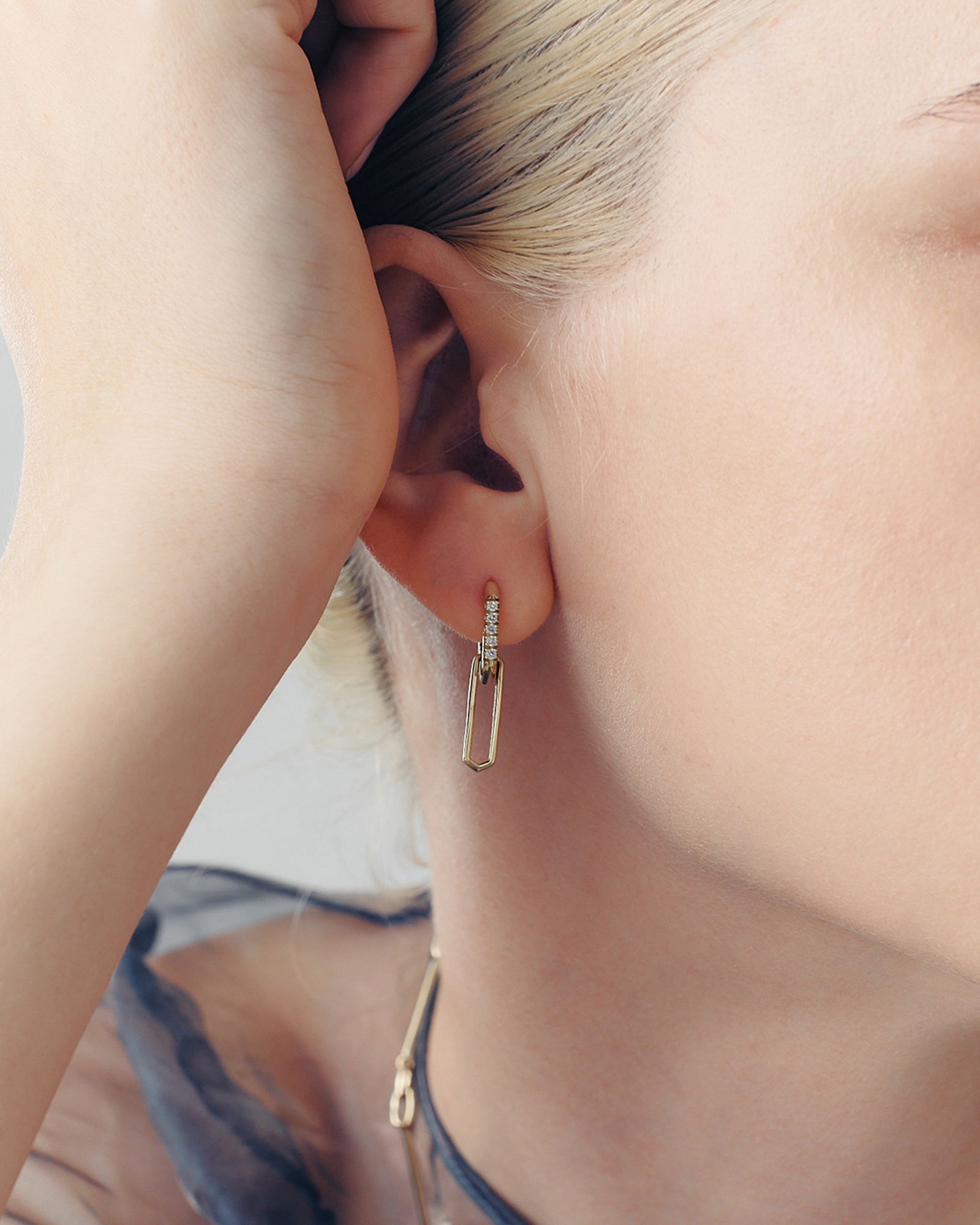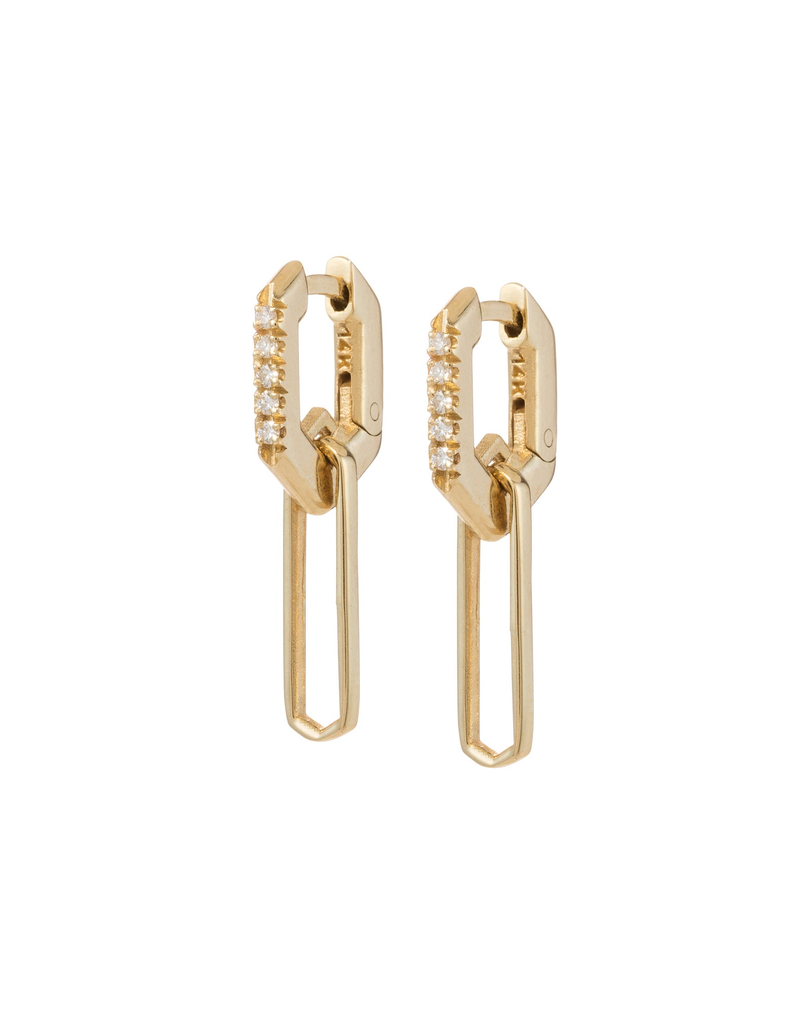 Indulge in the sparkling beauty of our Alex Long hoops. The hexagon-shaped earrings feature five delicate diamonds in each, complemented by a hexagonal gold link that adds a contemporary touch to a timeless design.