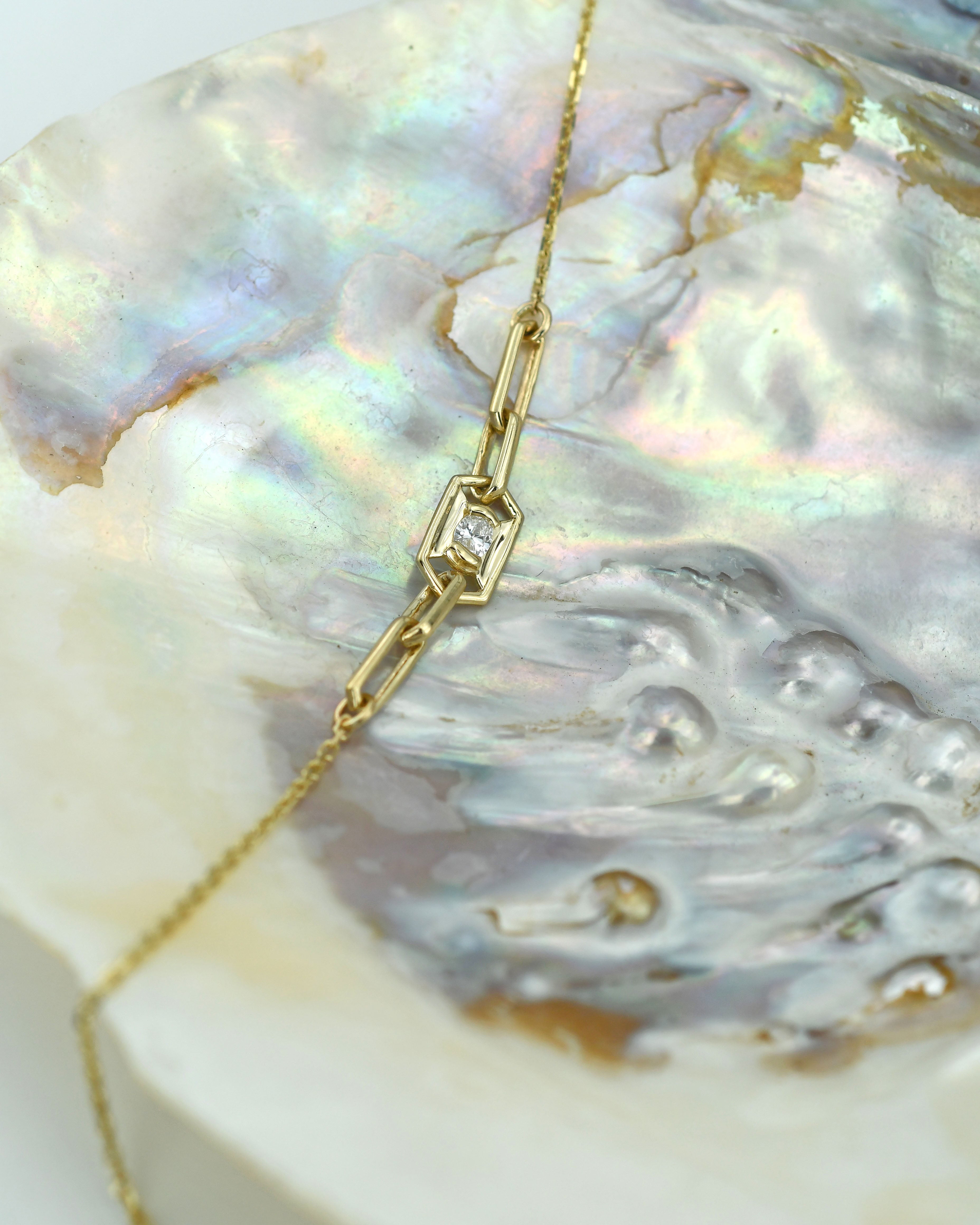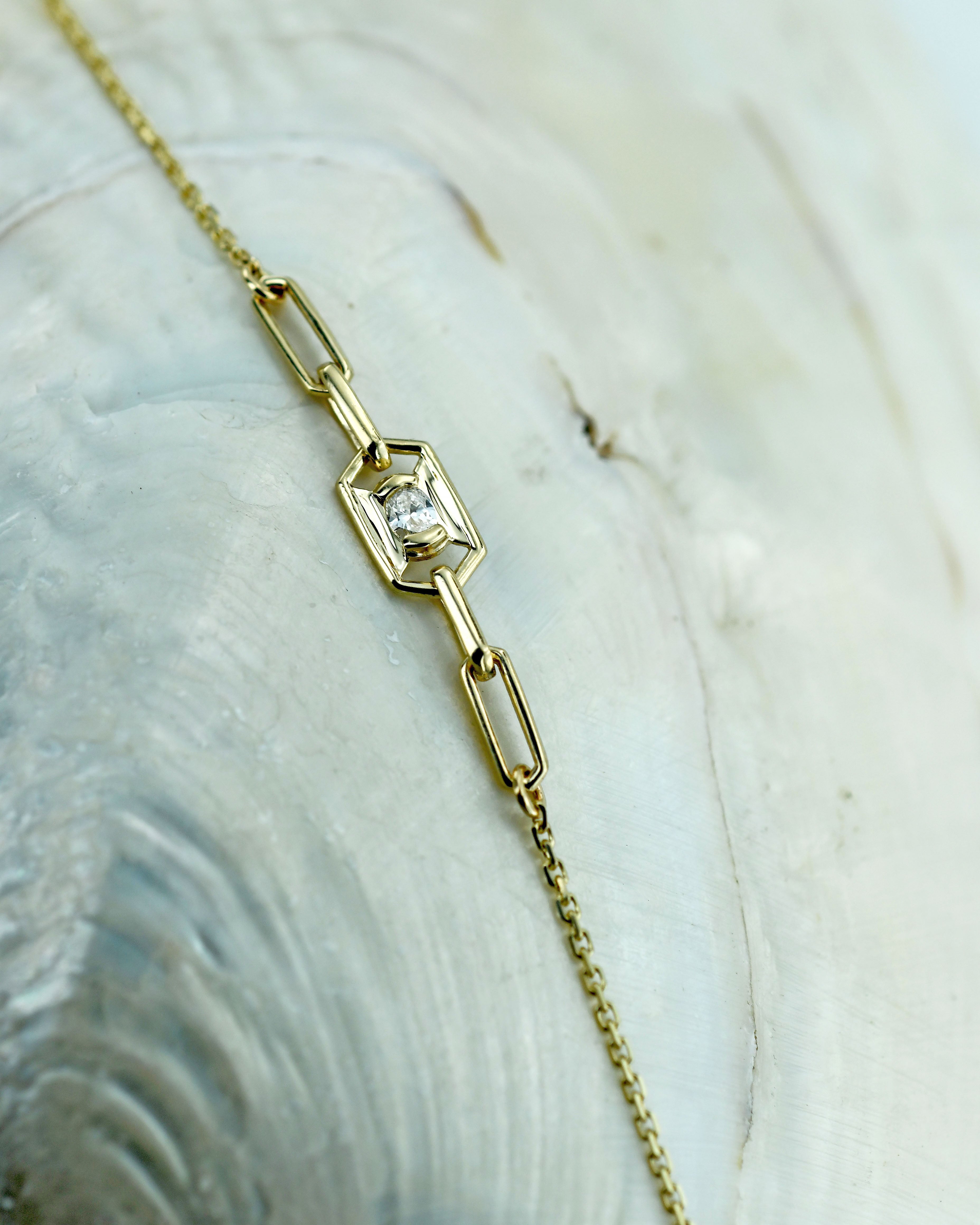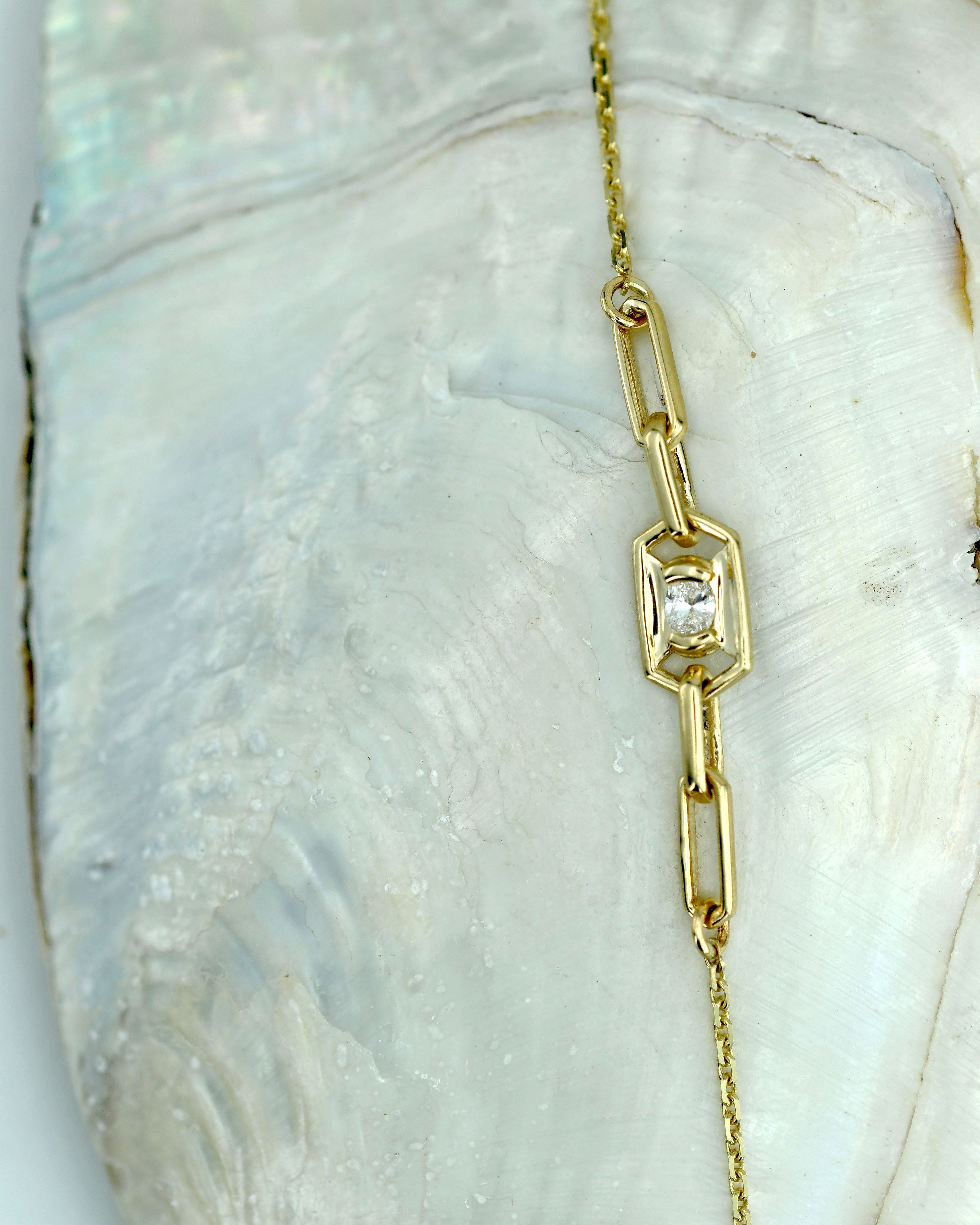 Featuring an oval cut white diamond encrusted in a gold medallion, the Alexis bracelet is a stunning combination of gourmet and refinement. Its contemporary design makes it the perfect element to add timeless chic to any wrist. Wear it on its own to make a statement or pair it with other bracelets for a stylish, layered look.