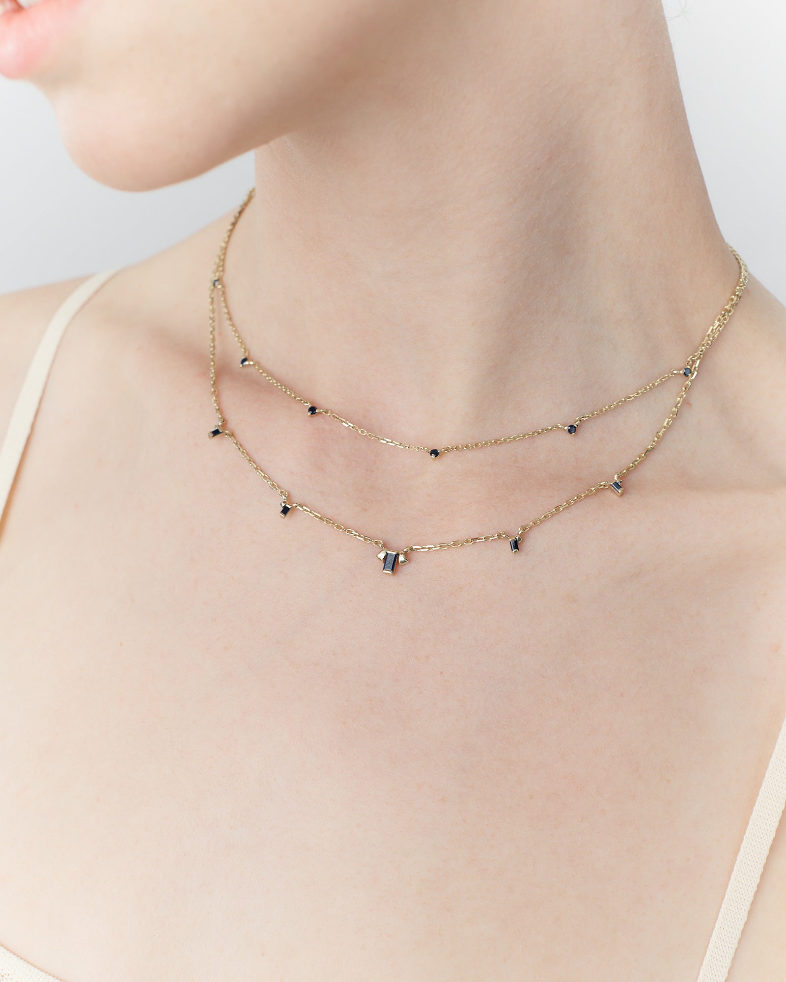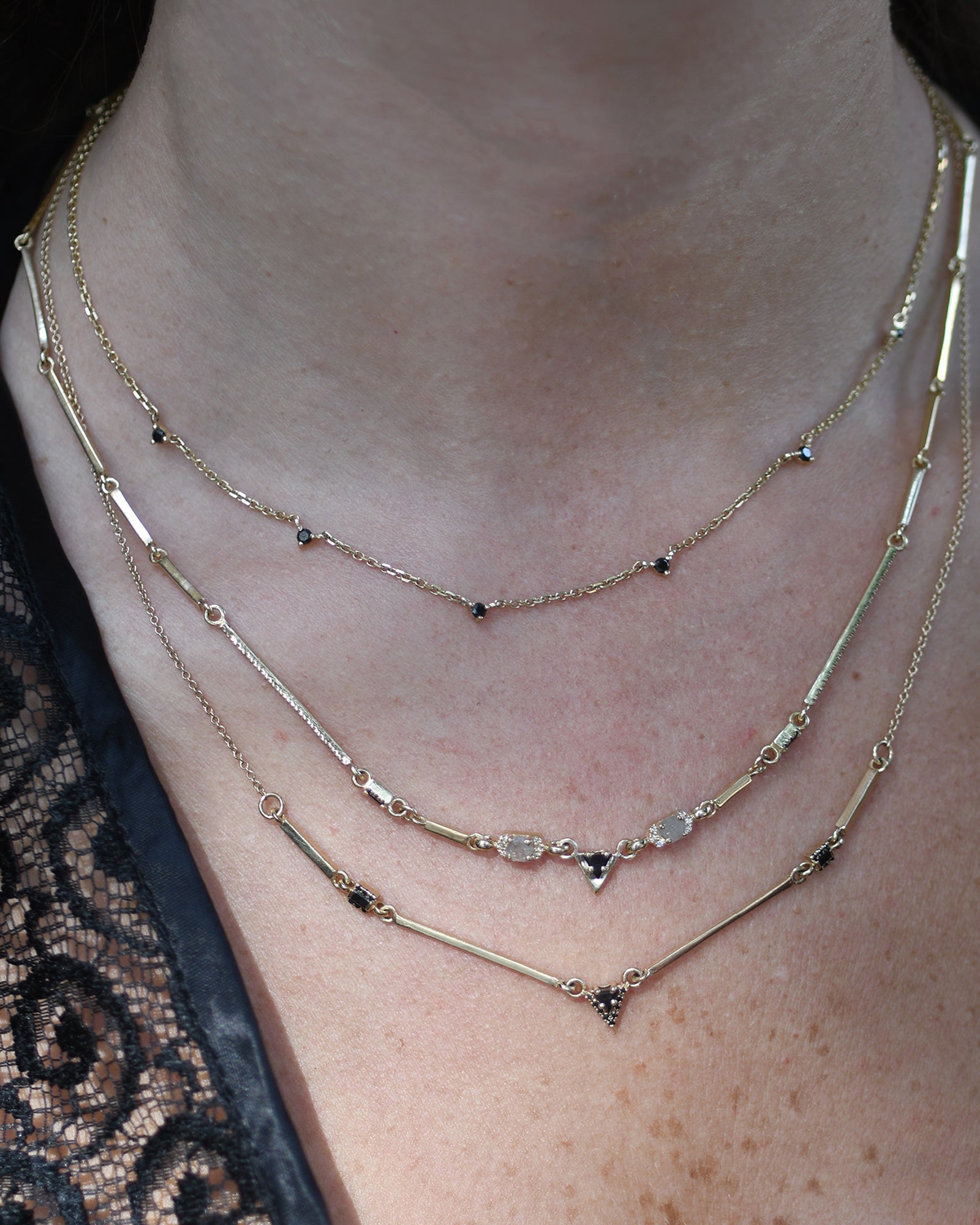 Embark on an enchanting journey with our Allure Black Diamonds Necklace, where darkness meets brilliance. Its delicate chain gracefully cradles five mesmerizing black diamonds, casting a mysterious glow that captivates the eye. Whether worn solo, exuding sophistication, or layered for an edgy statement, this necklace enchants with its versatility. Let the spectacular presence of Allure transport you to a realm where magic unfolds, capturing hearts like the sparkling stars that adorn the dark night sky.