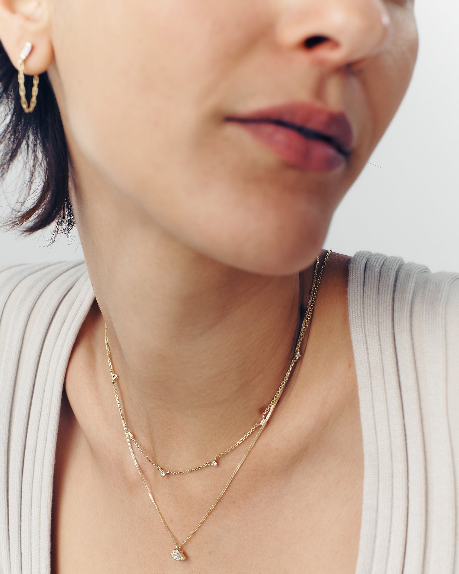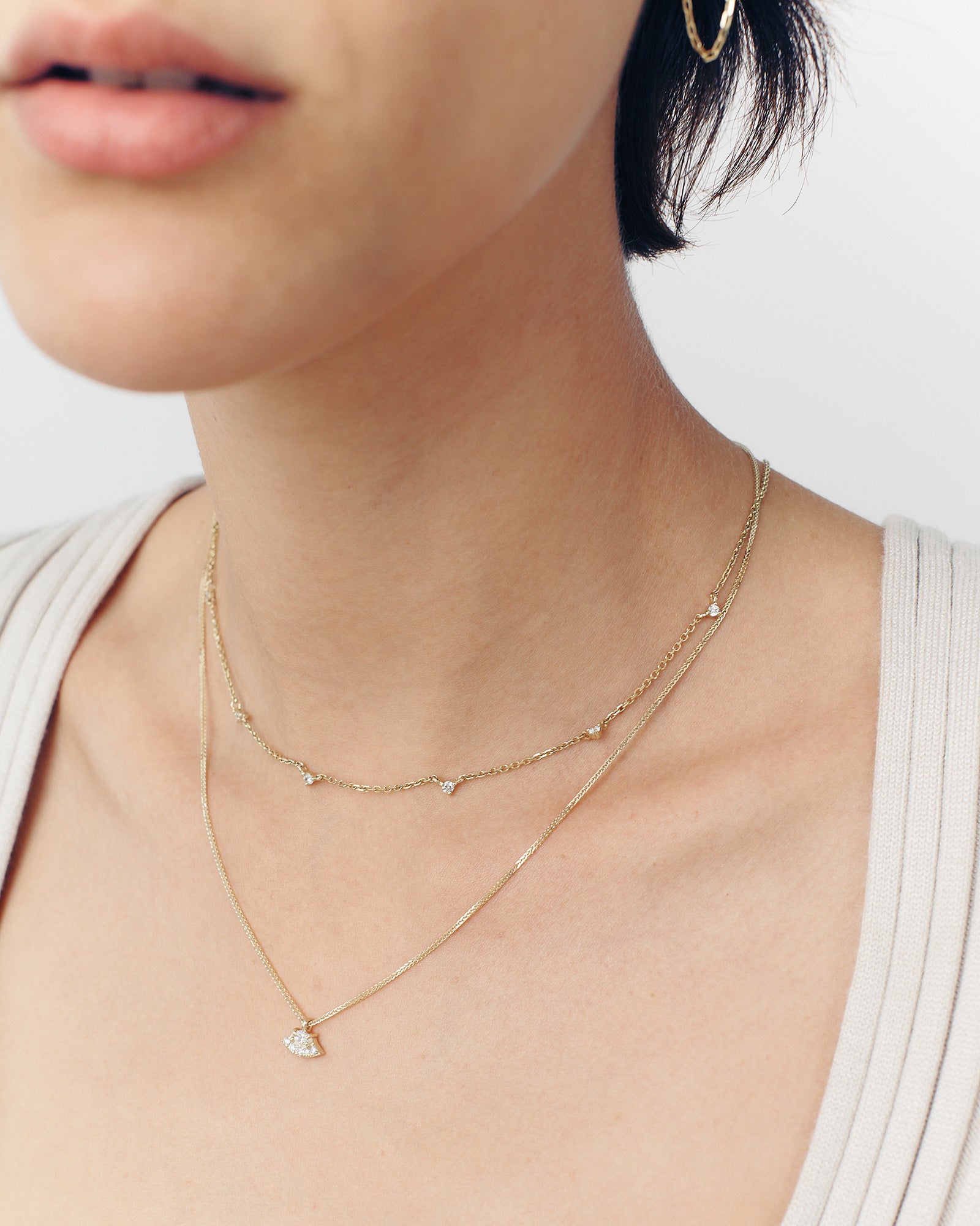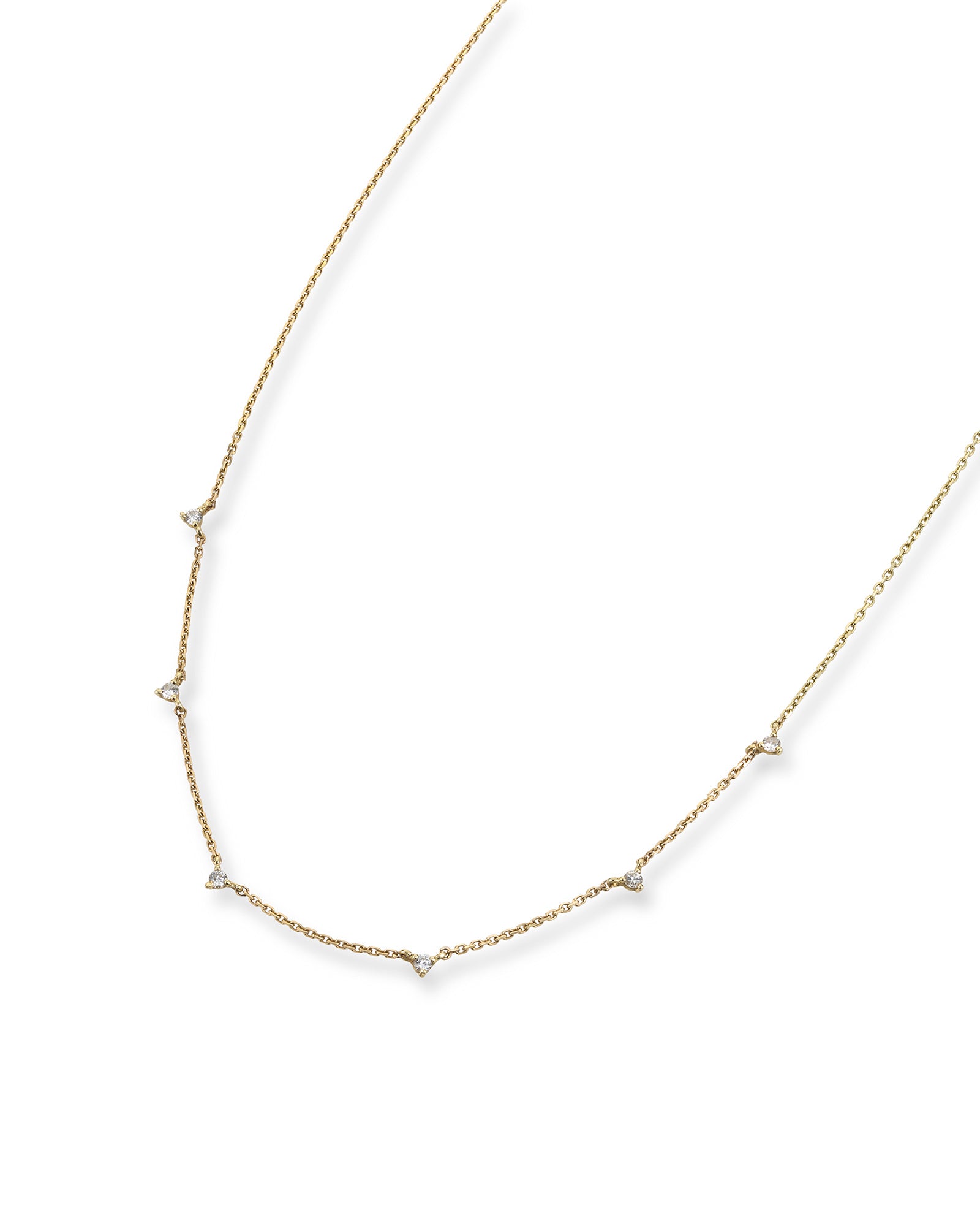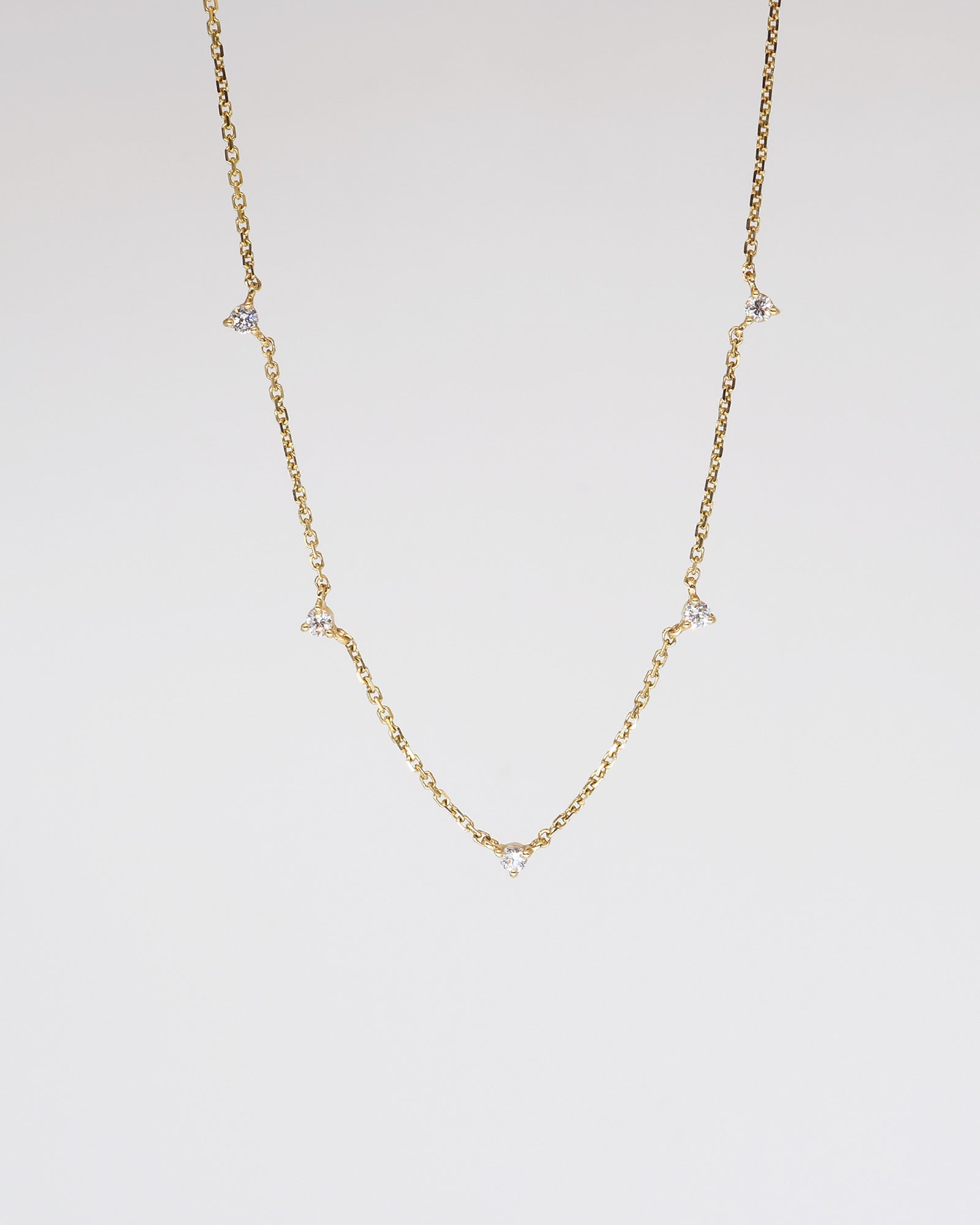 Experience the enchantment of our Allure White Diamonds Necklace. Its delicate chain gracefully holds five shimmering diamonds, casting a celestial glow upon your neckline. Whether worn alone for a refined and dainty look or layered to complement other necklaces, its versatility captivates hearts and ignites the imagination. Let the luminous glow of Allure transport you to a realm where enchantment holds sway, capturing hearts like the twinkling stars that grace the night sky.
