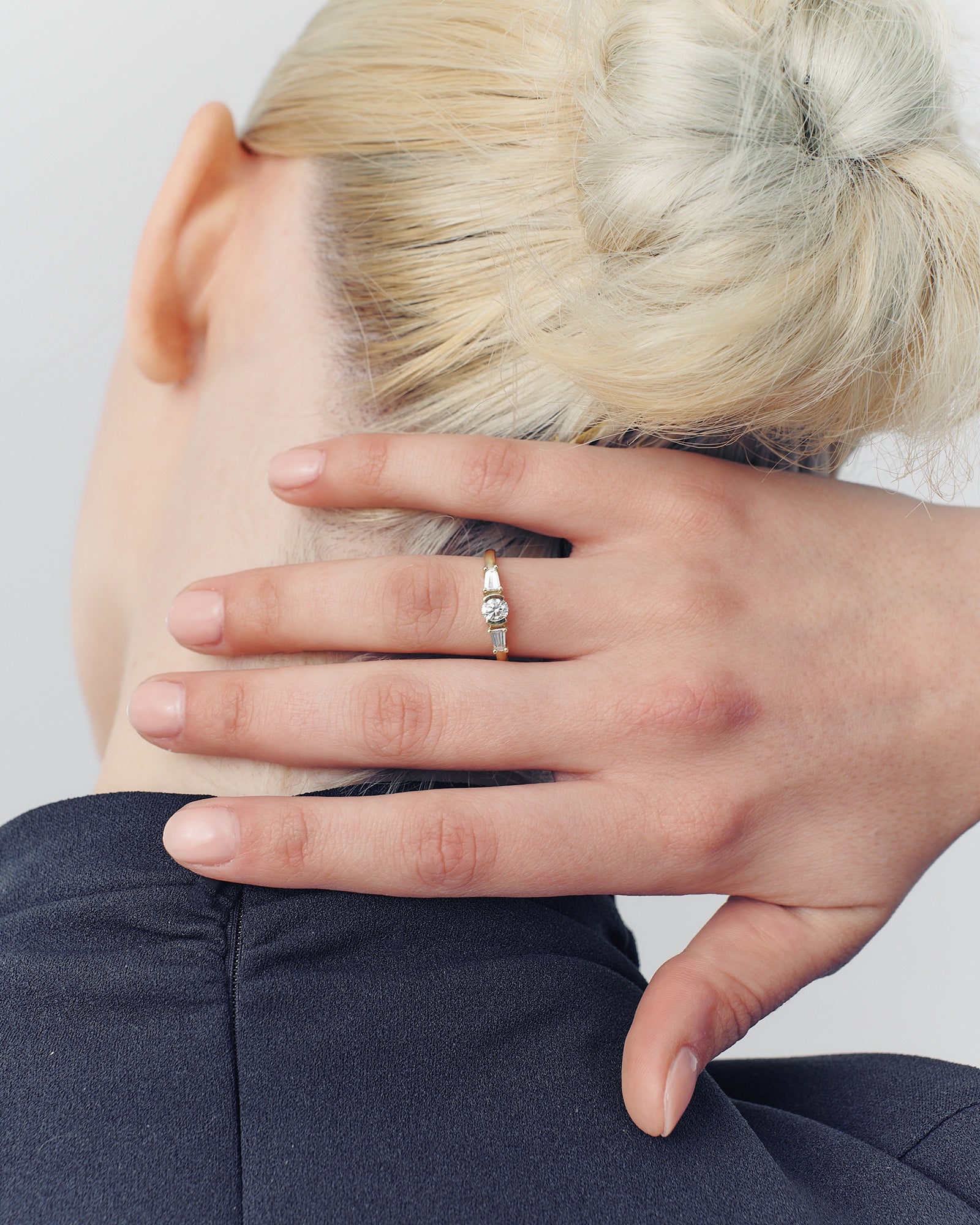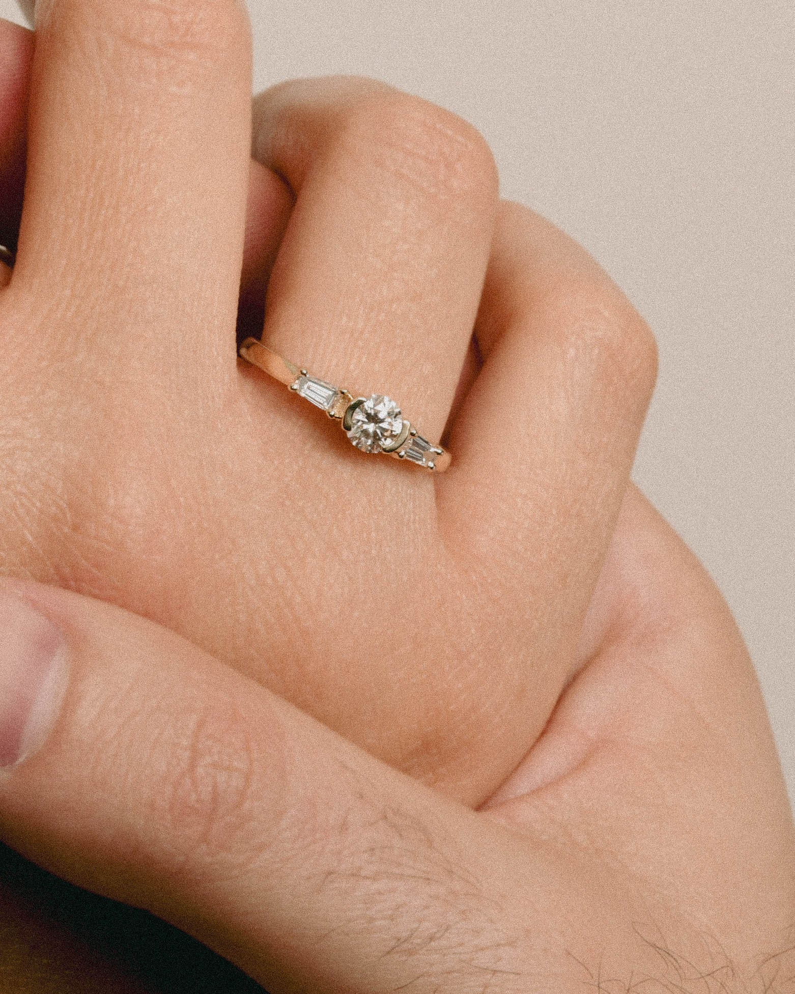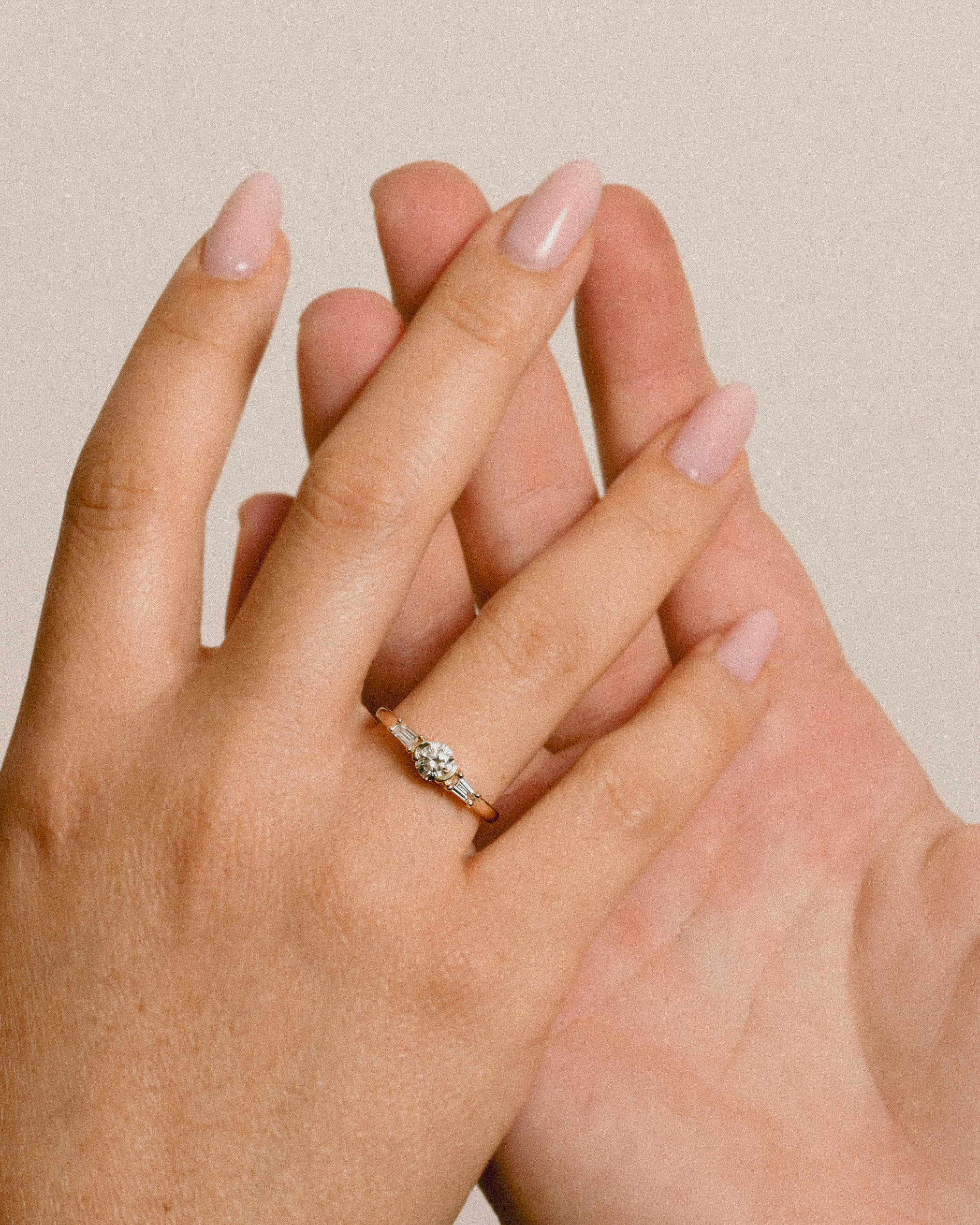 Indulge in the grace and refinement of our Audrey engagement ring, adorned with a brilliant-cut central diamond and two side tapers that radiate an irresistible shimmer. This ring is sure to captivate and enchant, for a lifetime of love and happiness.