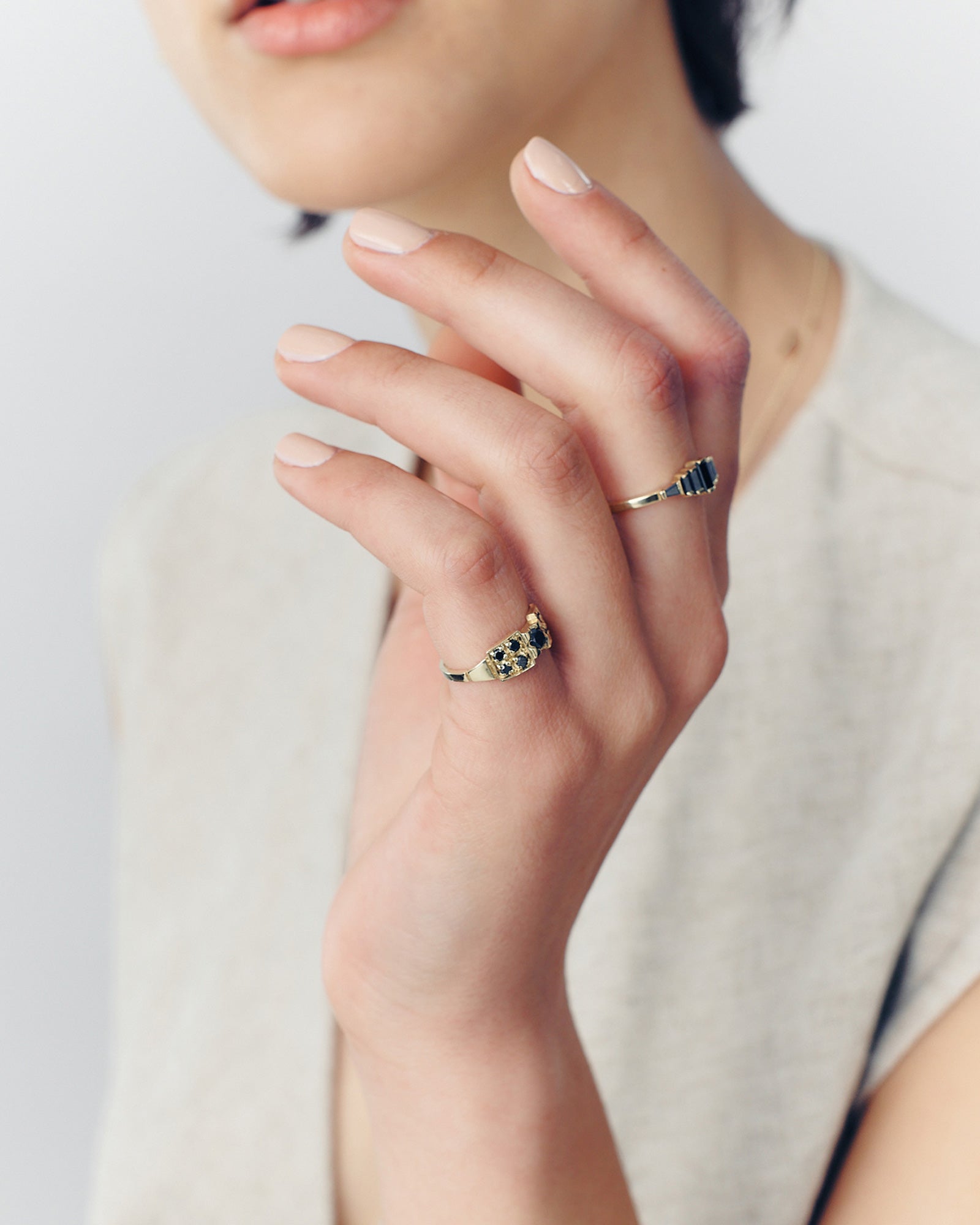 Step into a world of refined craftsmanship with our exquisite Daisy ring. Set with a mosaic of glistening black diamonds, each reflects light in a subtle, mesmerizing manner, creating a striking contrast against the skin. Its intricate and detailed shapes create a captivating display, enchanting all who admire its mysterious beauty.