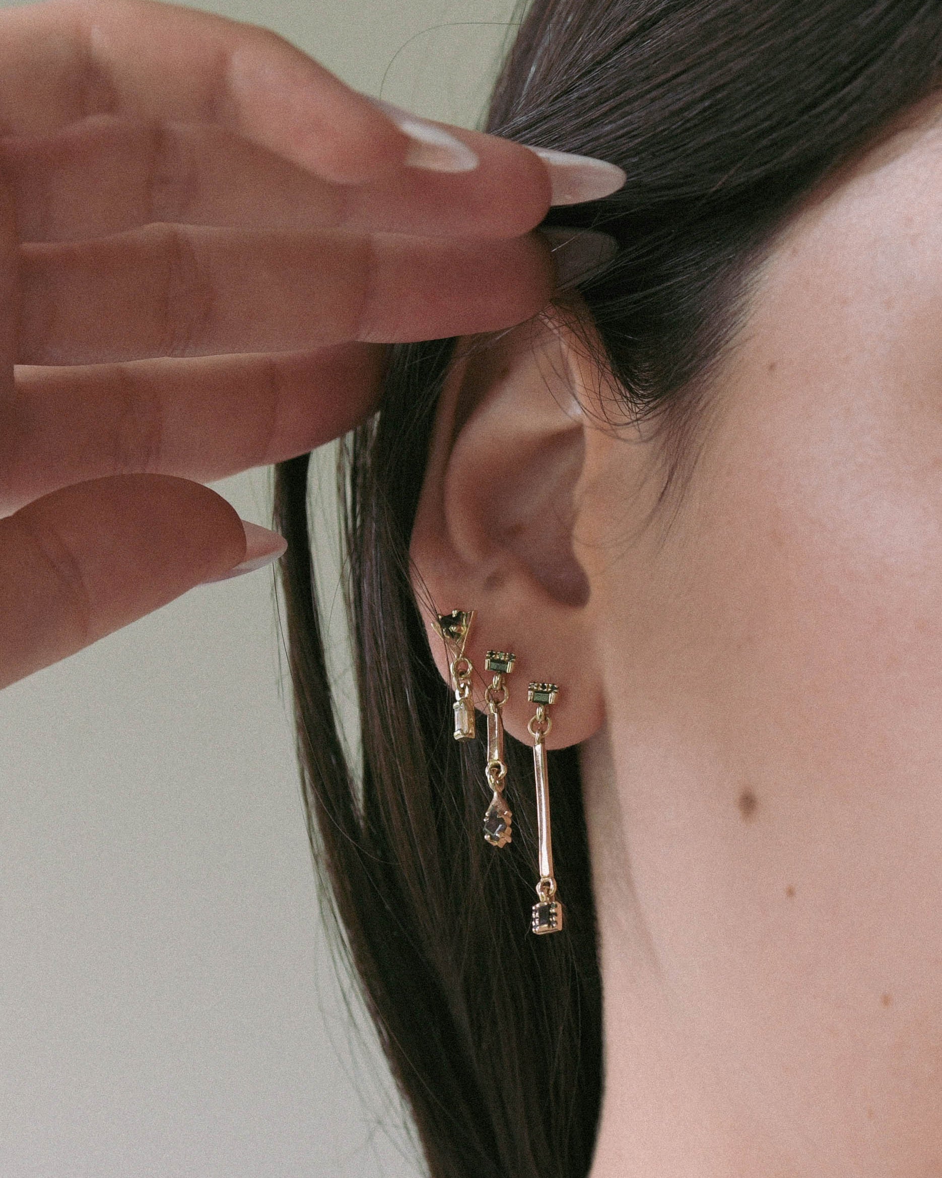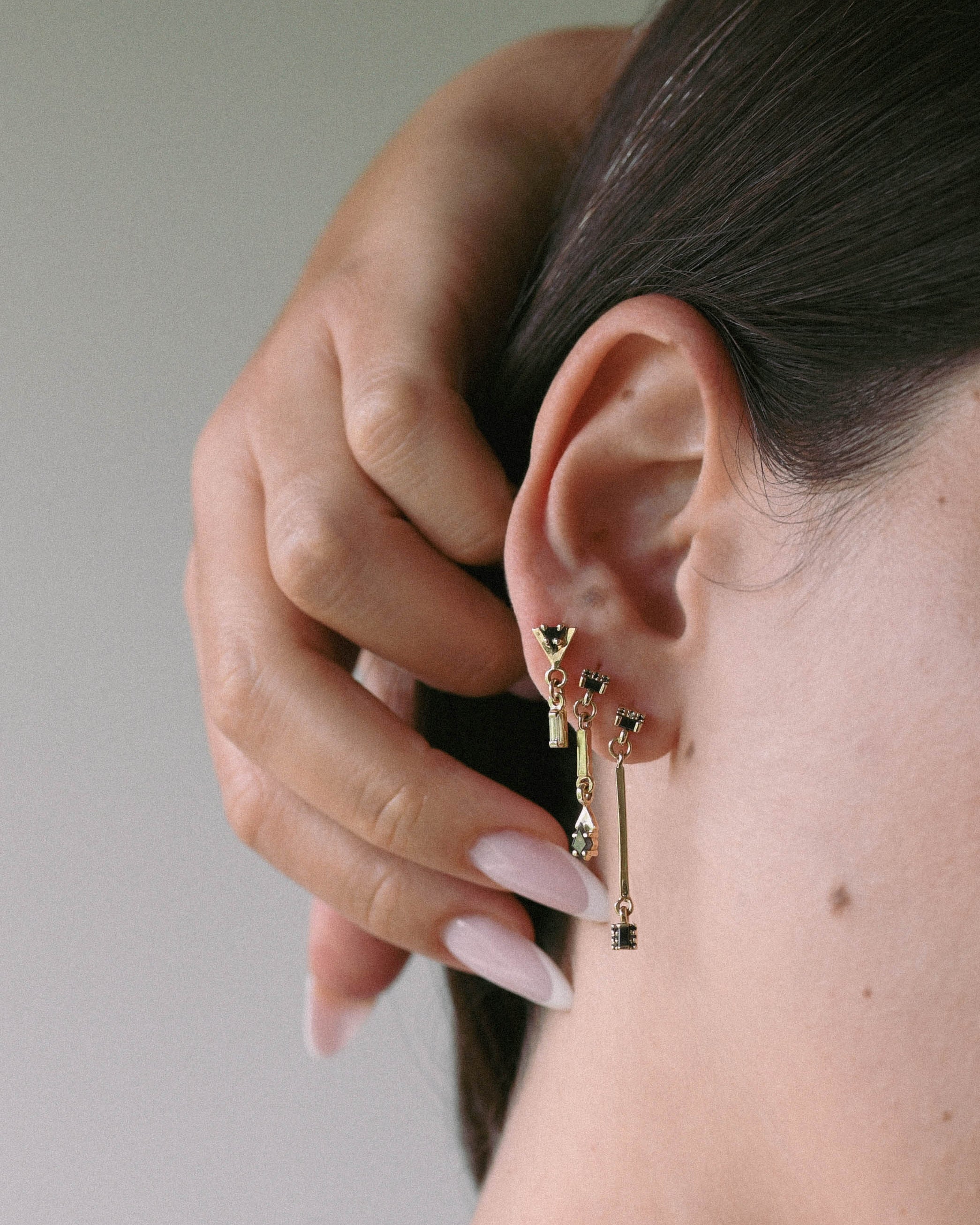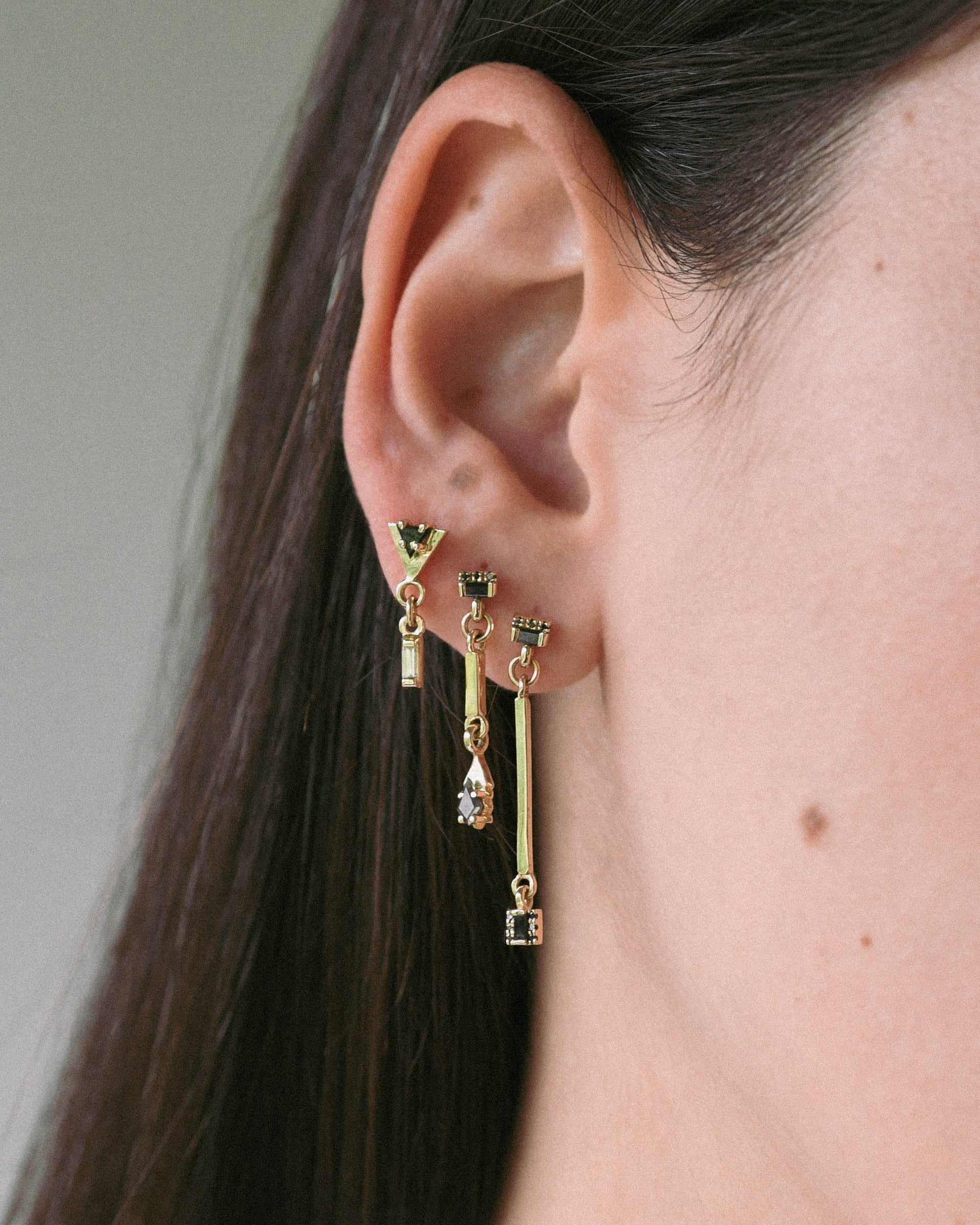 Get noticed with our Eco earrings, featuring two deco-inspired elements joined by a delicate gold link for an extra dangly feel. The stunning black and gray diamond setting adds to their majestic charm, making them a must-have for those who appreciate the appeal of high-end jewelry.