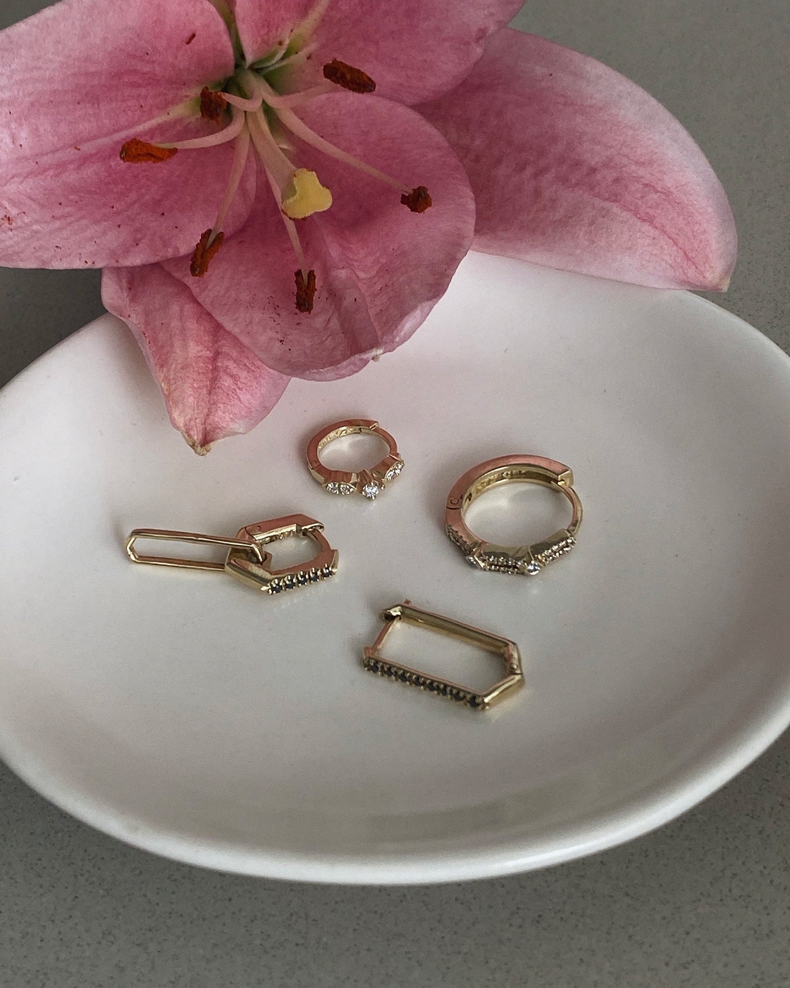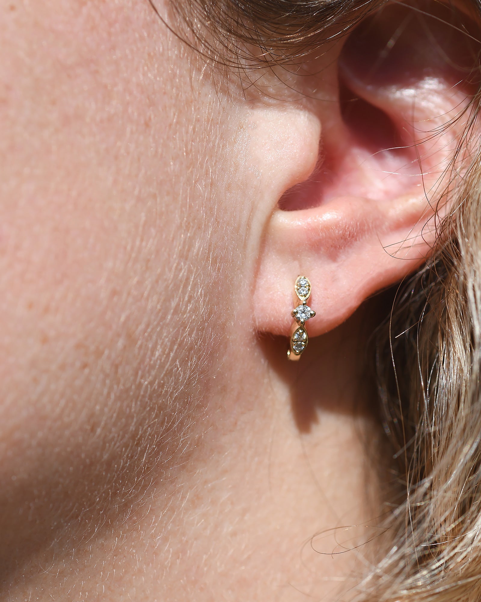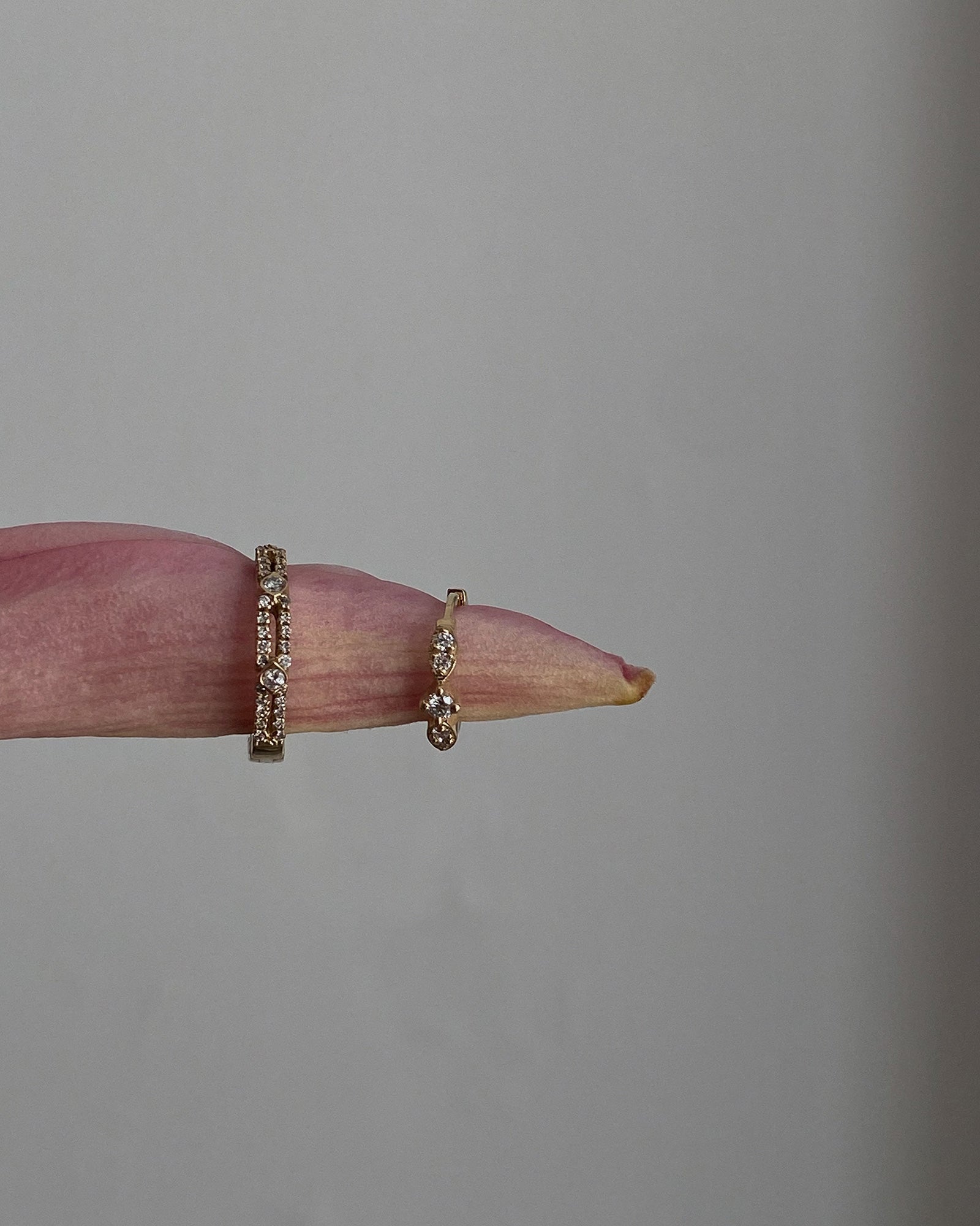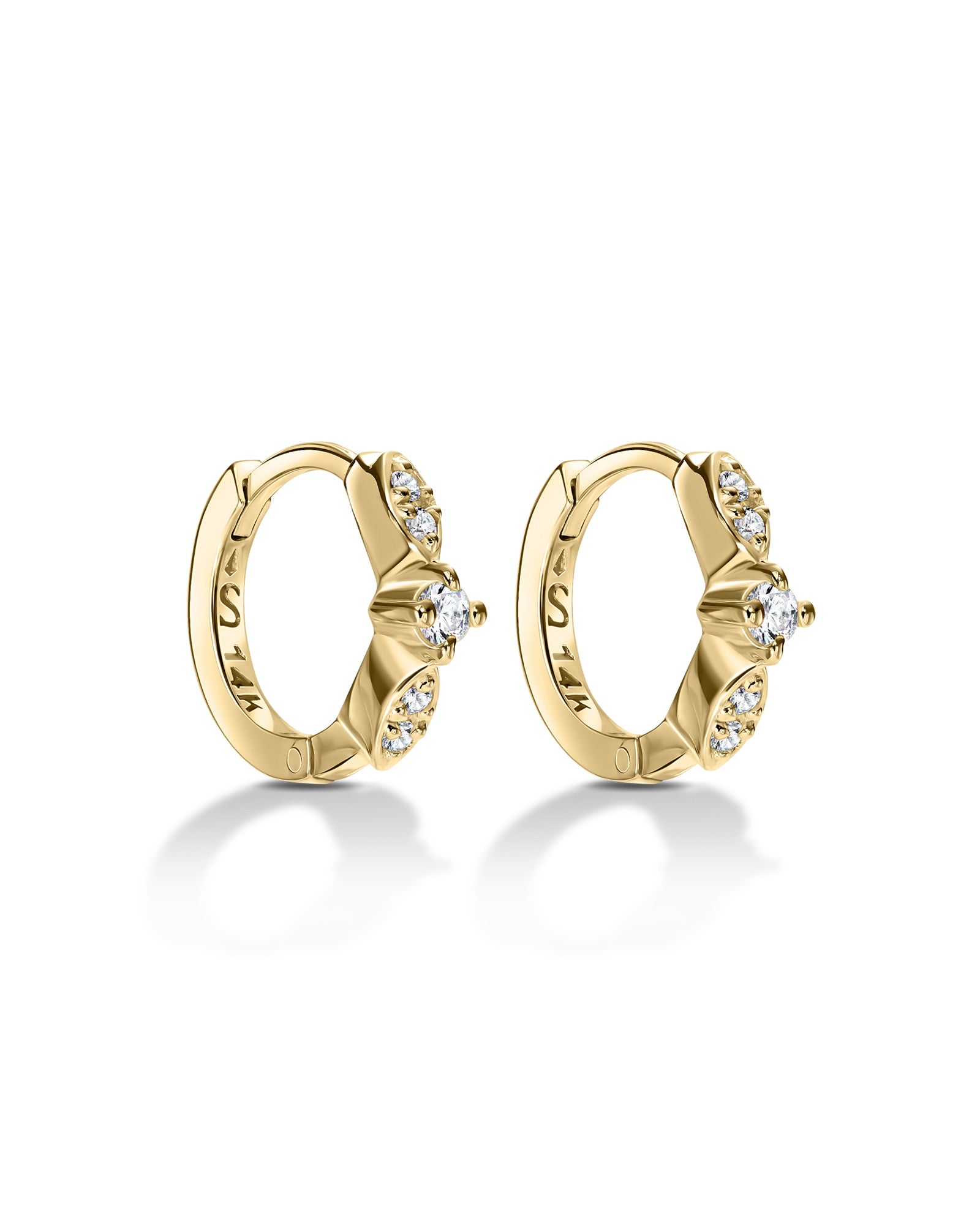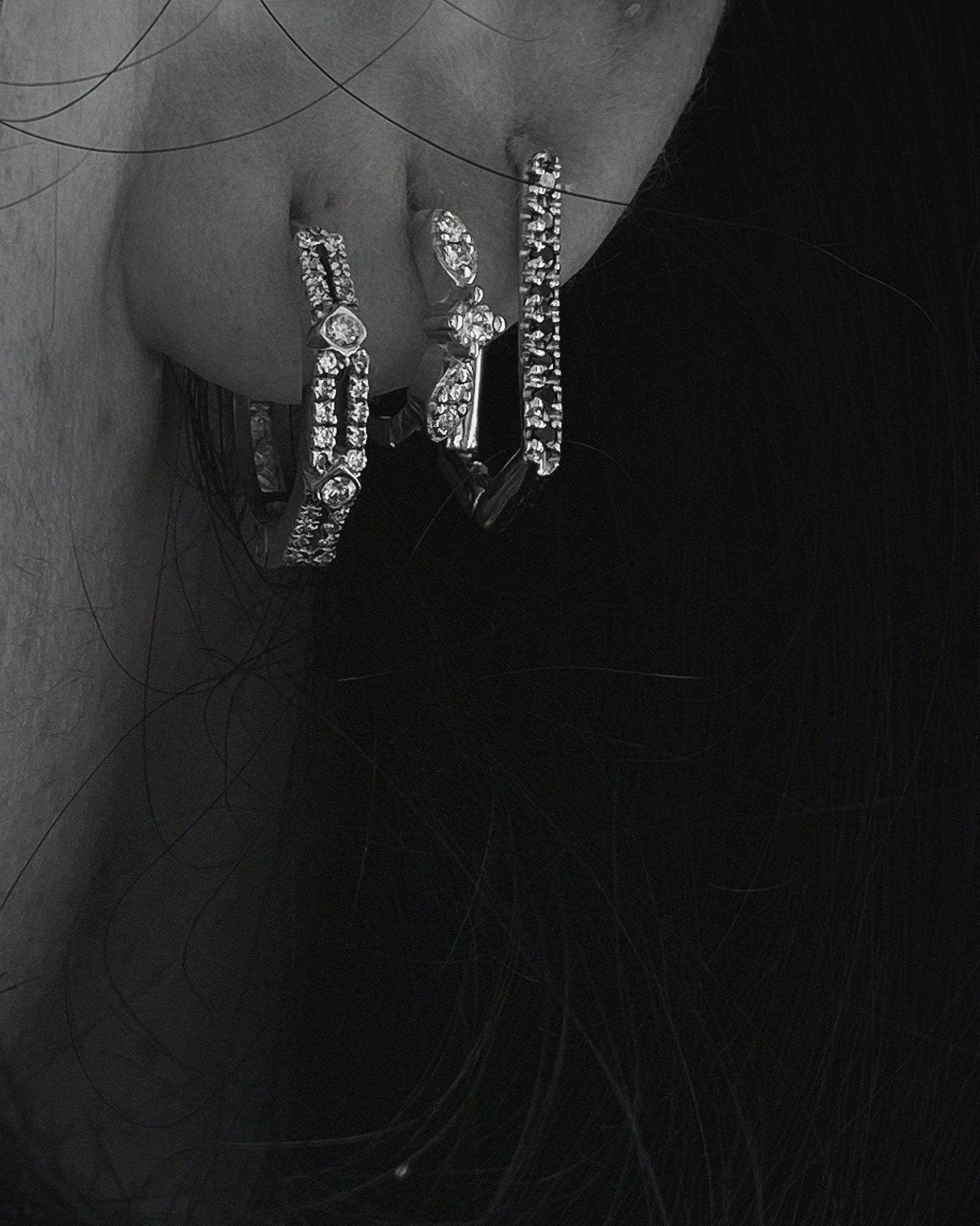 The Eve hoop earrings skilfully blend the grace of the past with a trendy and popular design, resulting in a captivating fusion of elements. The circular shape of the hoops gracefully embraces an intricate and meticulous design, adorned with shimmering white diamonds that gently illuminate the ear.