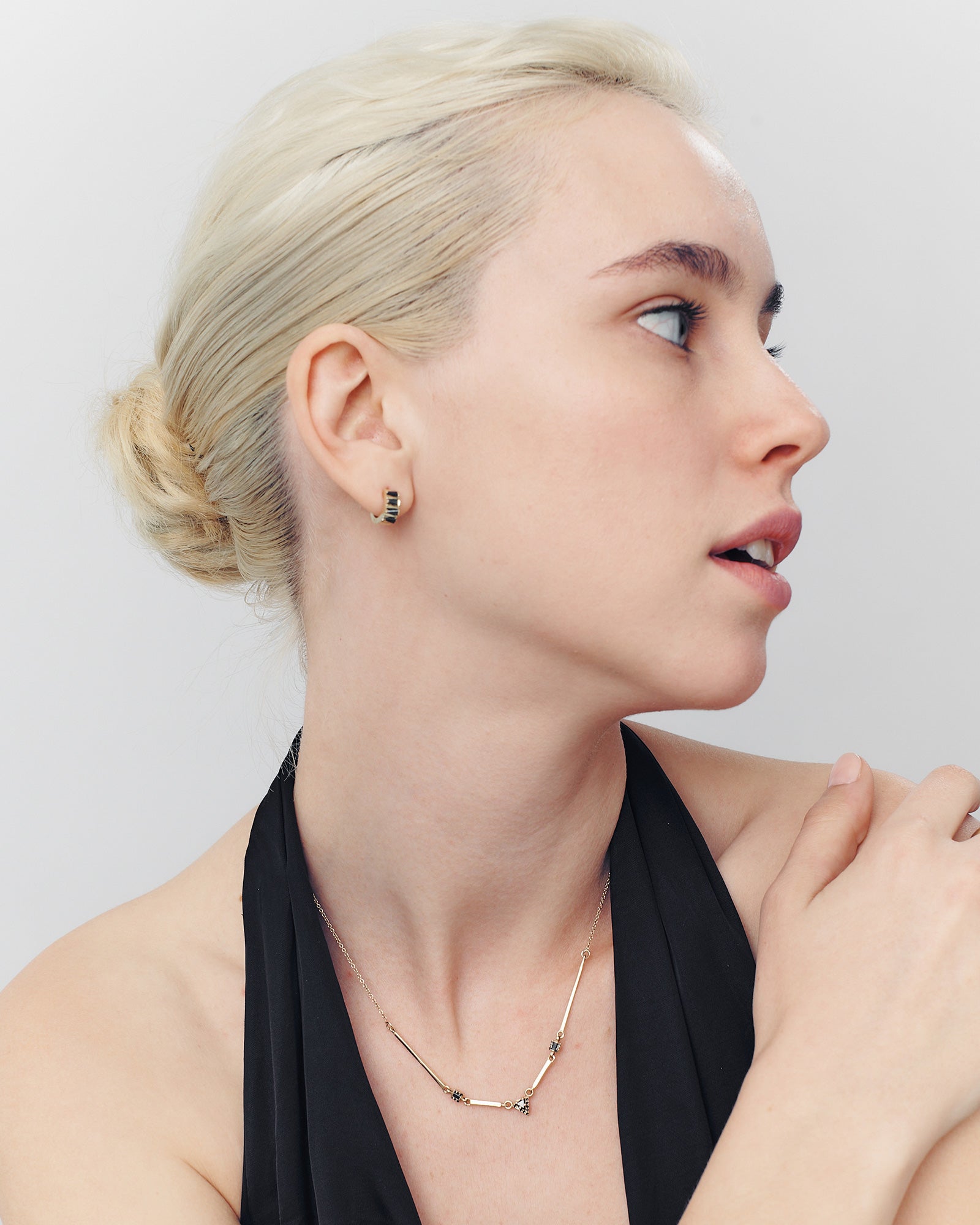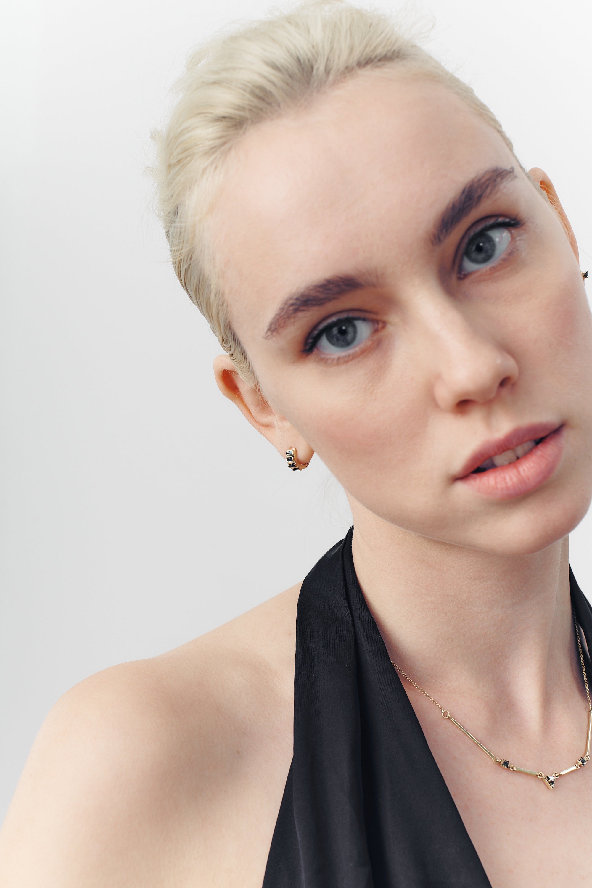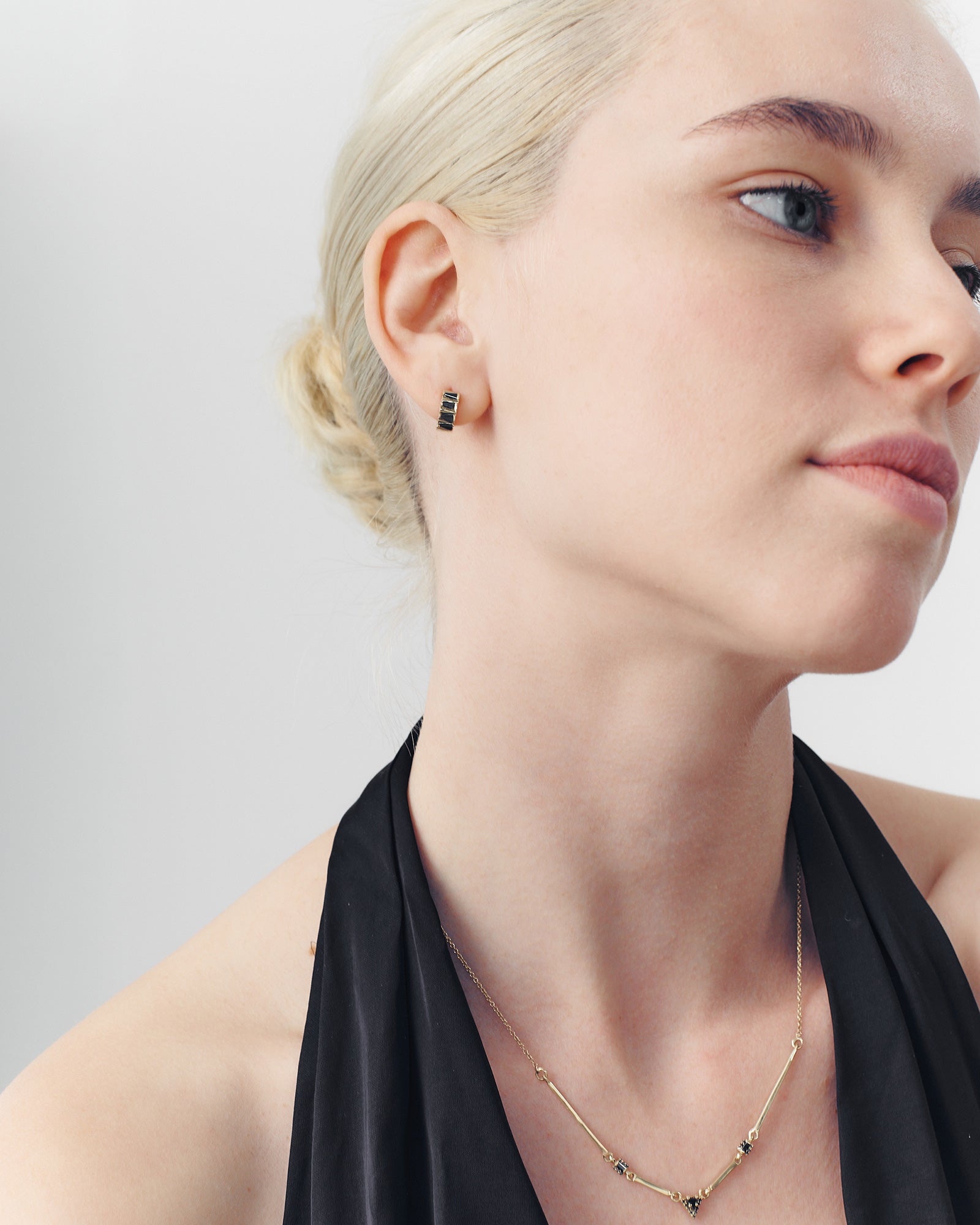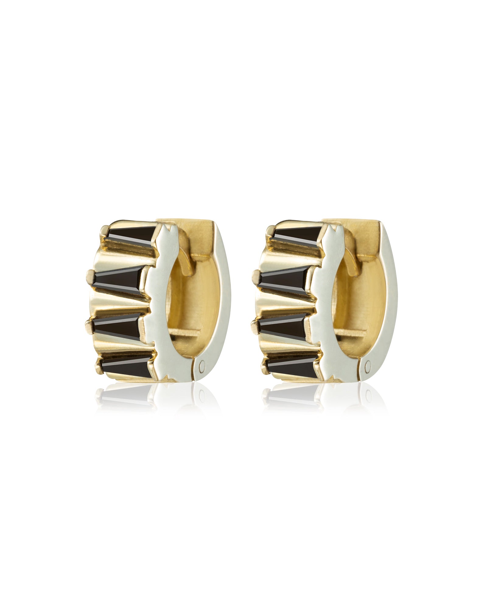 The Jackie hoop earrings are the embodiment of femininity, making them an ideal choice for women who possess a clear sense of style and exquisite taste.Adorned with perfectly aligned taper-cut black diamonds, these earrings exude timeless elegance and will be treasured for years to come.