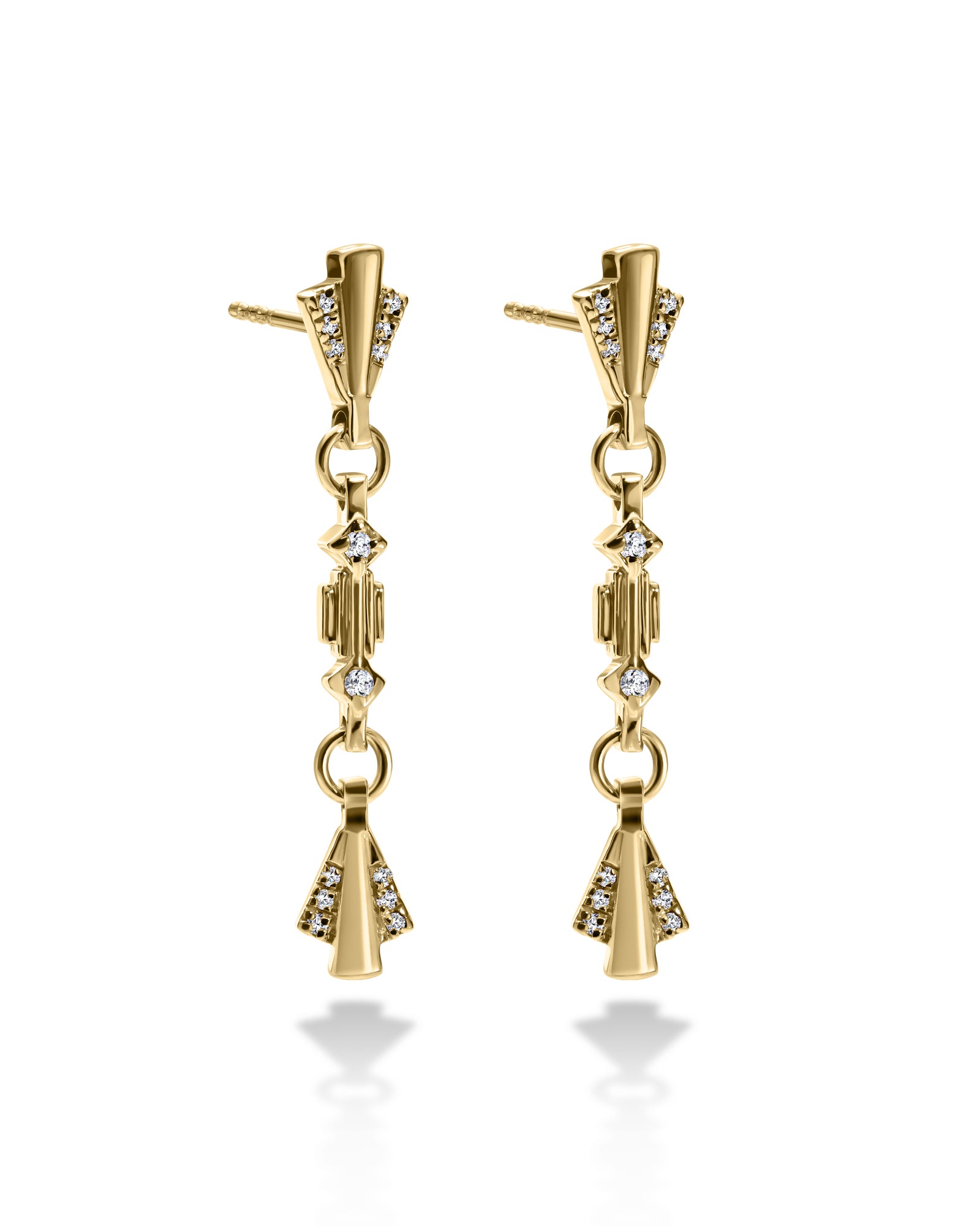 The Josephine earrings pay homage to the Art Nouveau movement with their long, dangly design featuring intricate gold patterns and dazzling diamonds. Ideal for art lovers, these earrings transport you to a bygone era with their European flair and exquisite craftsmanship.