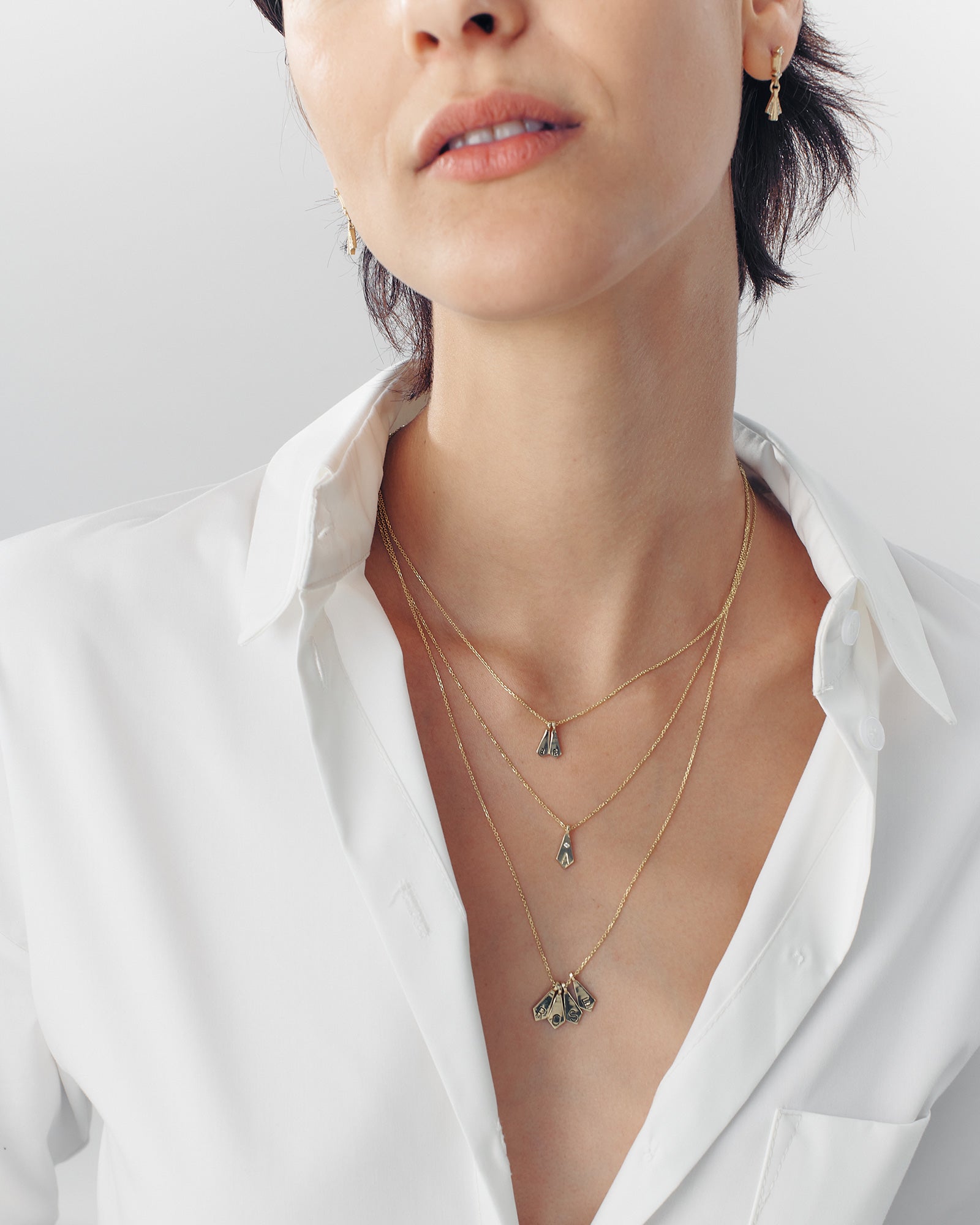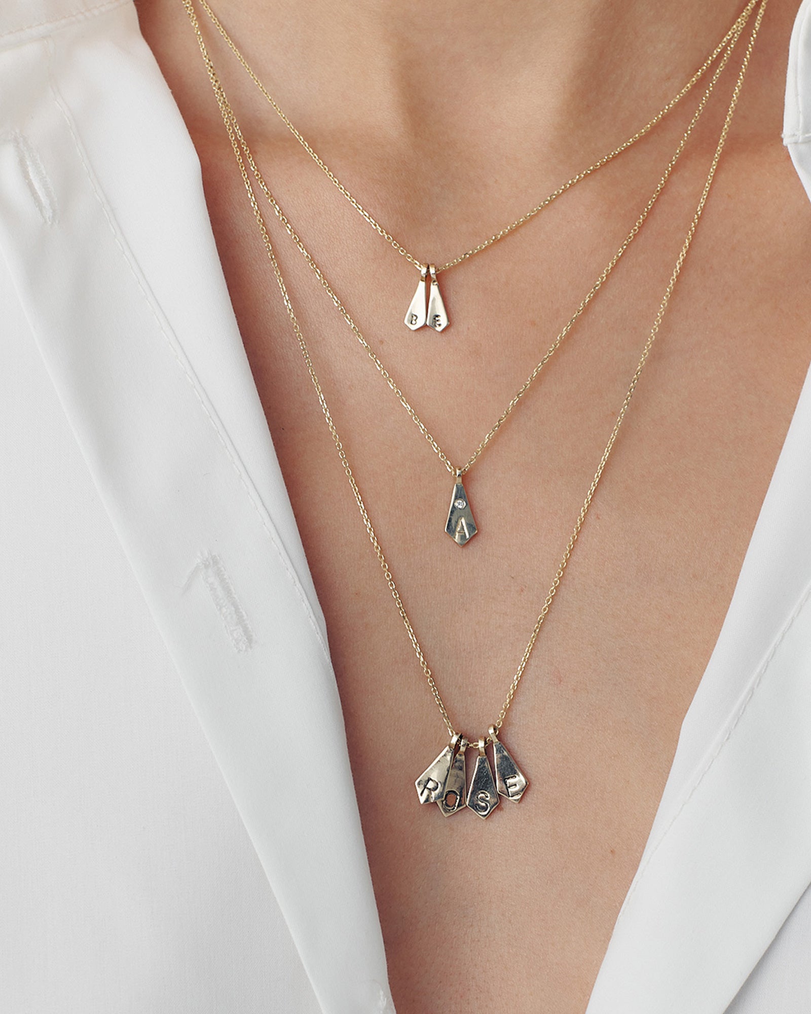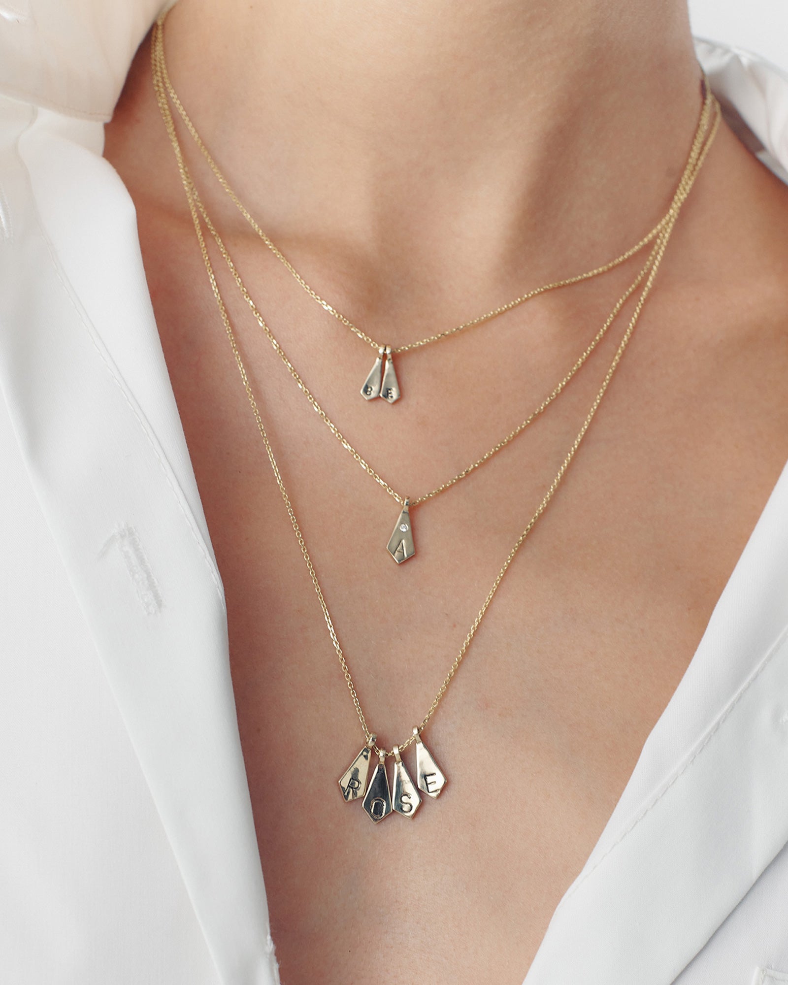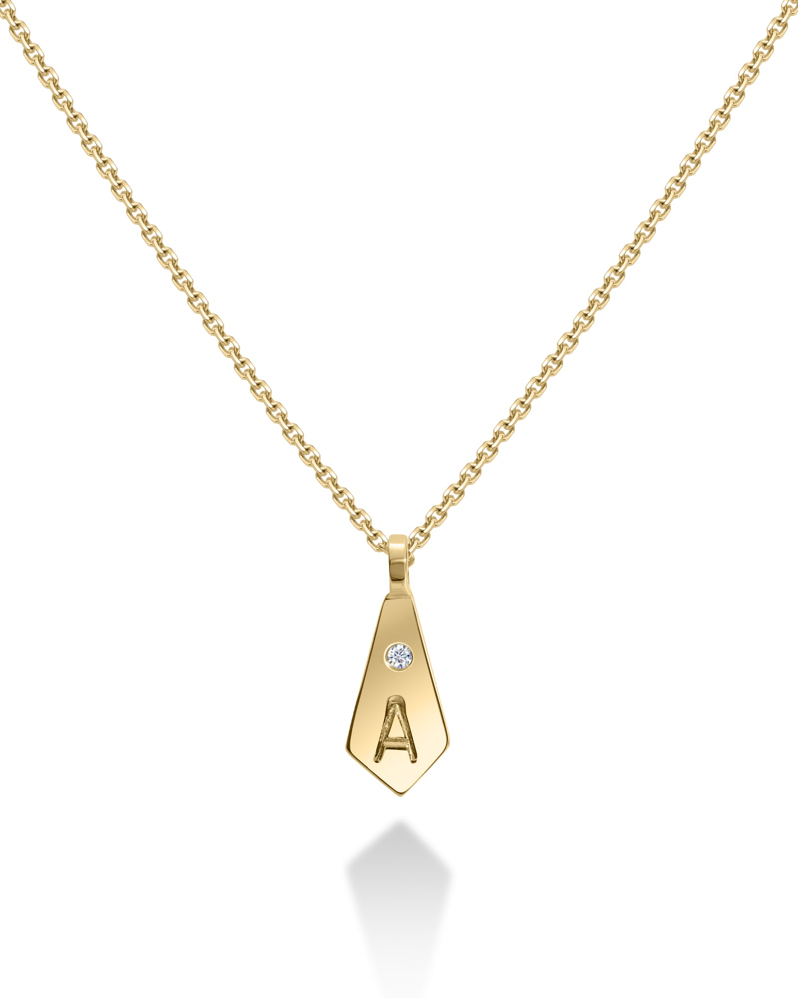 Adorned in elegance, our iconic gold and diamond Letter Necklace shines in the spotlight. Its petal pendant, delicately engraved with a cherished letter, glistens with a radiant white diamond. This treasure echoes your story, forever blooming close to your heart with beauty. A symbol of love, individuality, and grace, it narrates a tale that's uniquely yours to share. And the best part? You can add more pendants over time, creating a captivating story necklace that evolves with you.