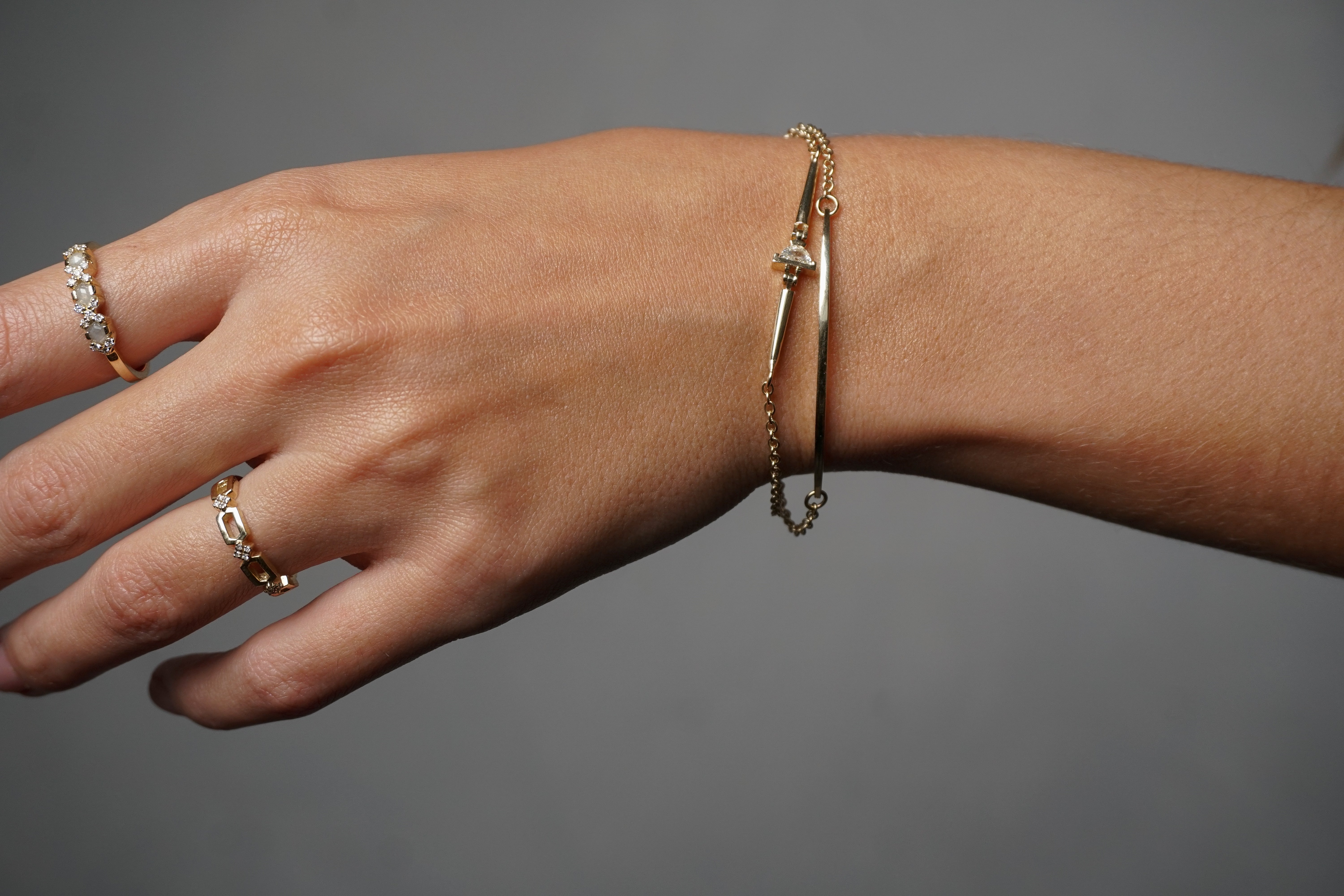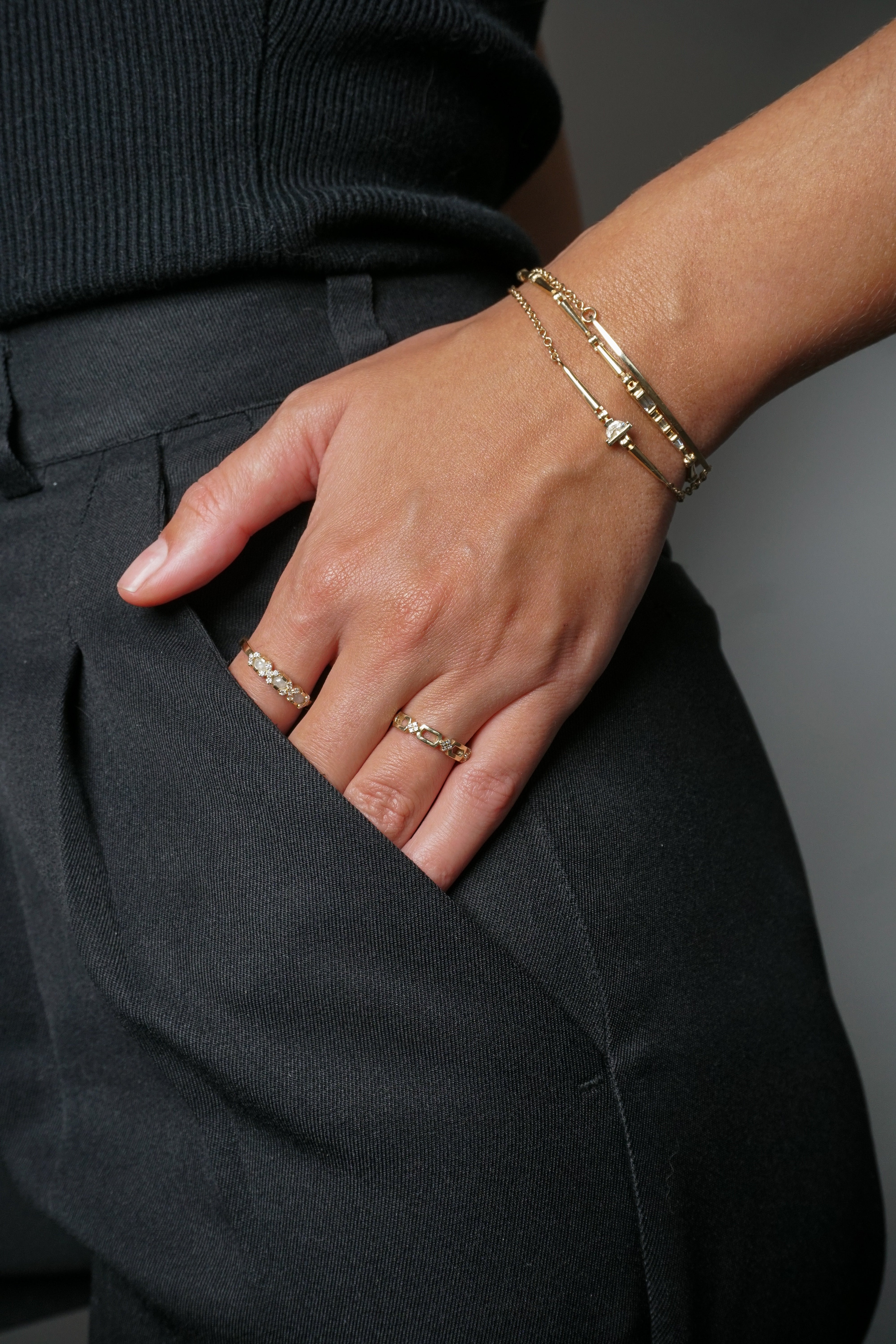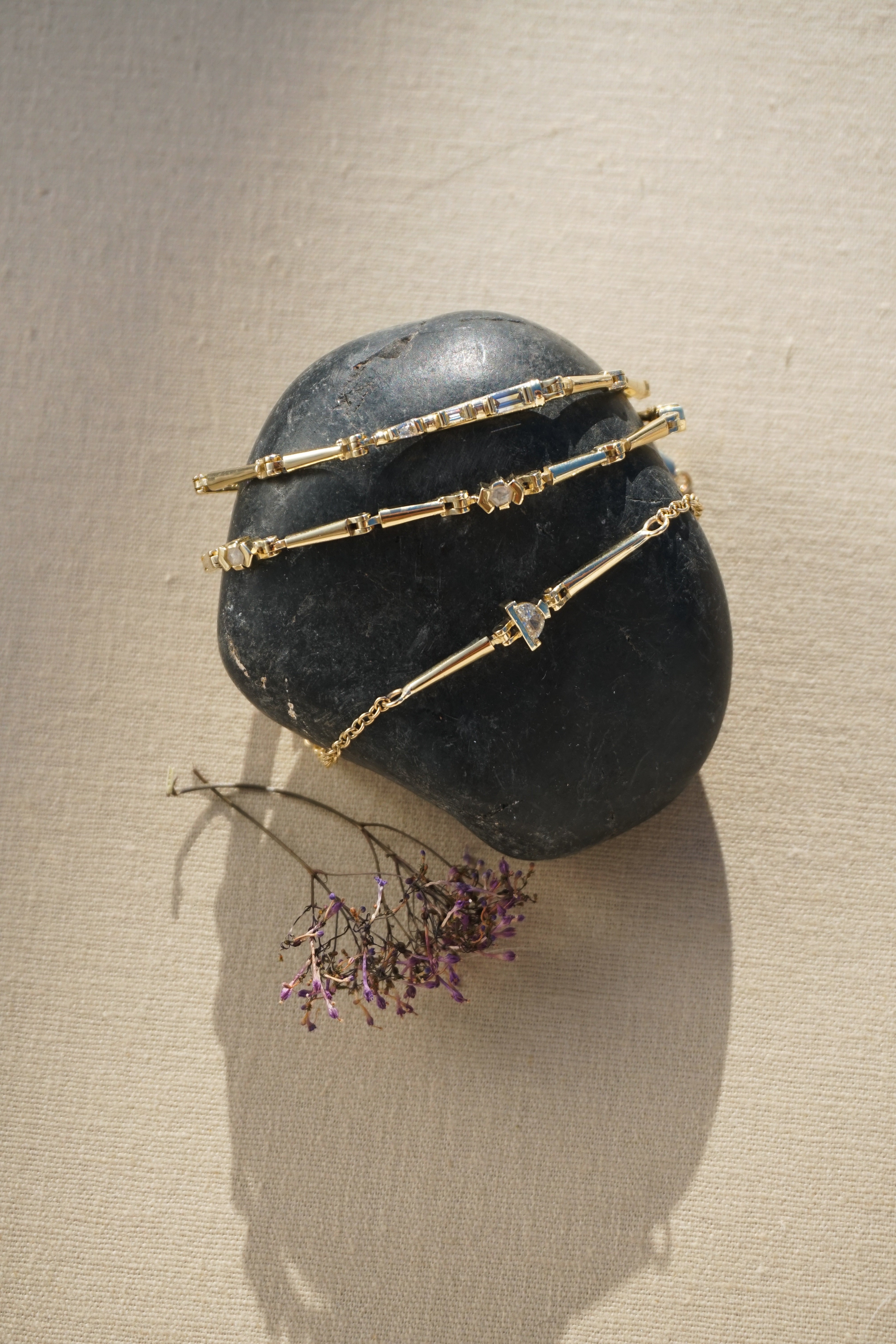 Bask in the ethereal beauty of the Lune bracelet, where a half-moon white diamond reigns supreme, embraced by glistening gold links. In this captivating masterpiece, brightness and light intertwine with finesse, creating a magical union of mystery and beauty. Let its radiant glory grace your wrist, a testament to the enchanting power of the bright sky.
