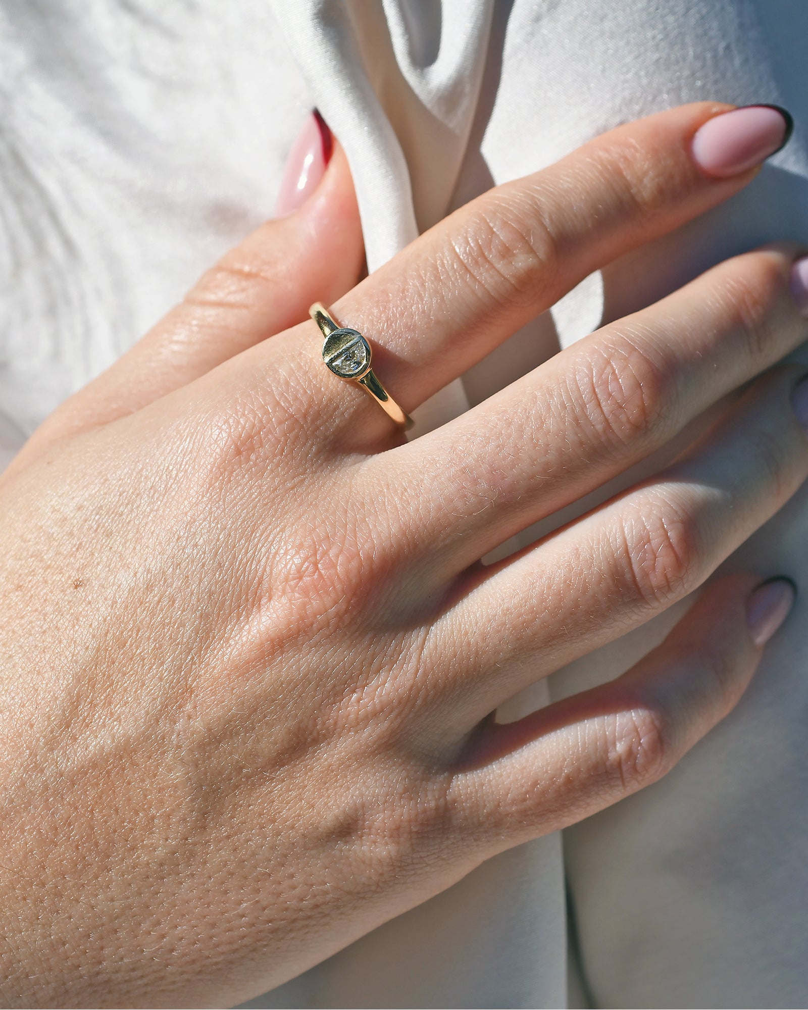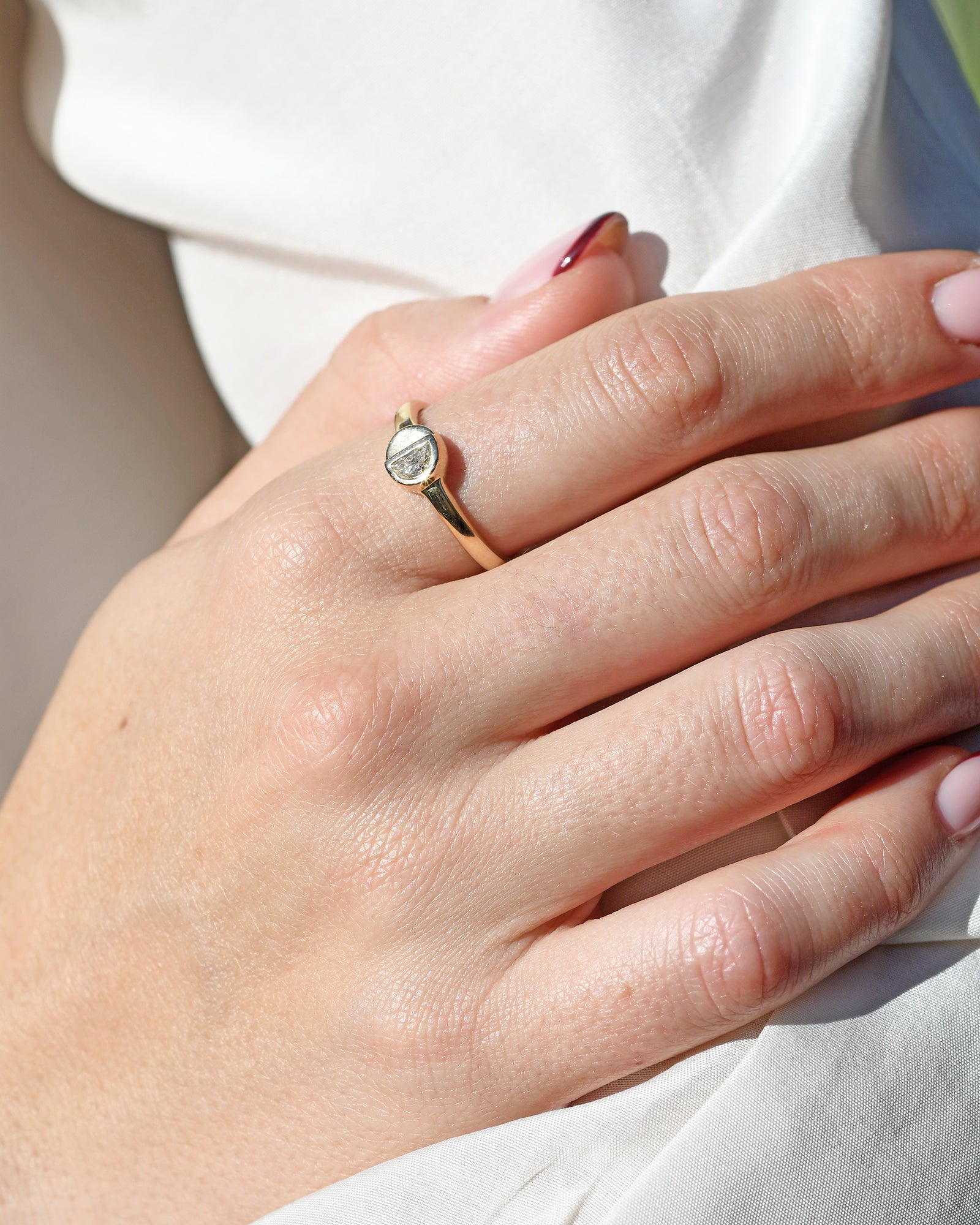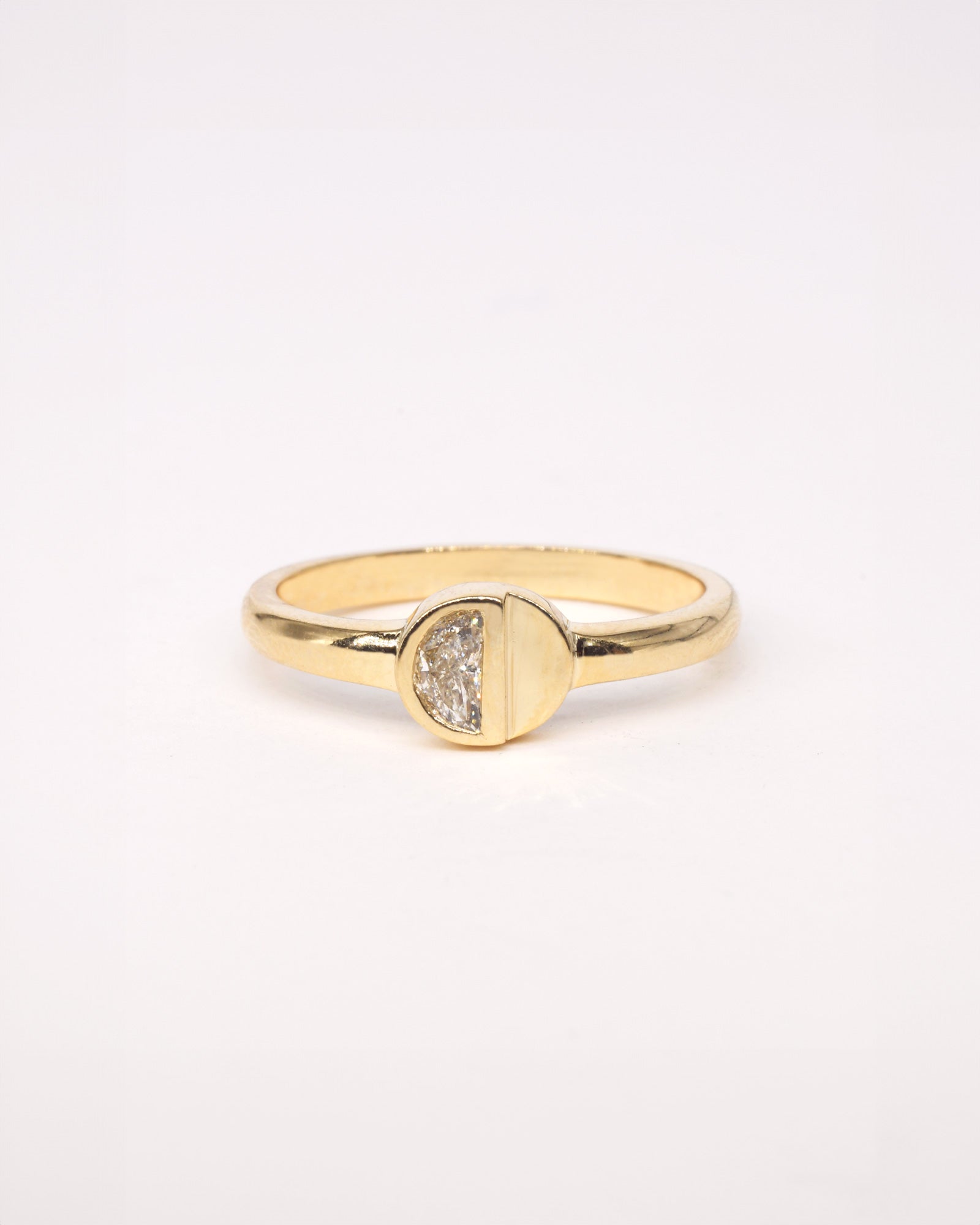 Designed for the starry-eyed and celestial admirers, the Moon Shadow Ring elegantlybridges the cosmos to your fingertips. Its round sleek gold setting cradles an enchanting singular white diamond, evoking the mysterious charm of a lunar eclipse.