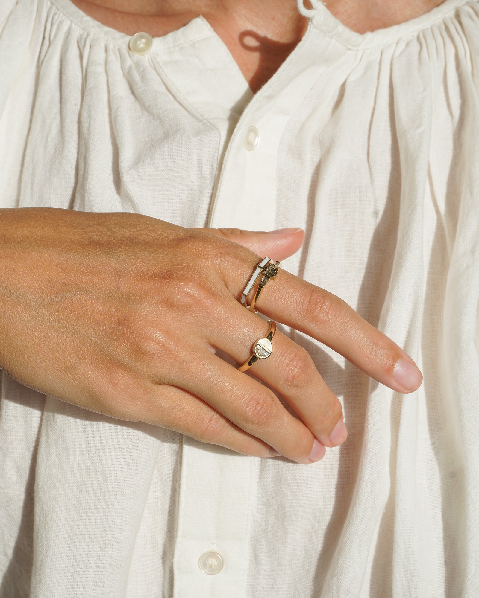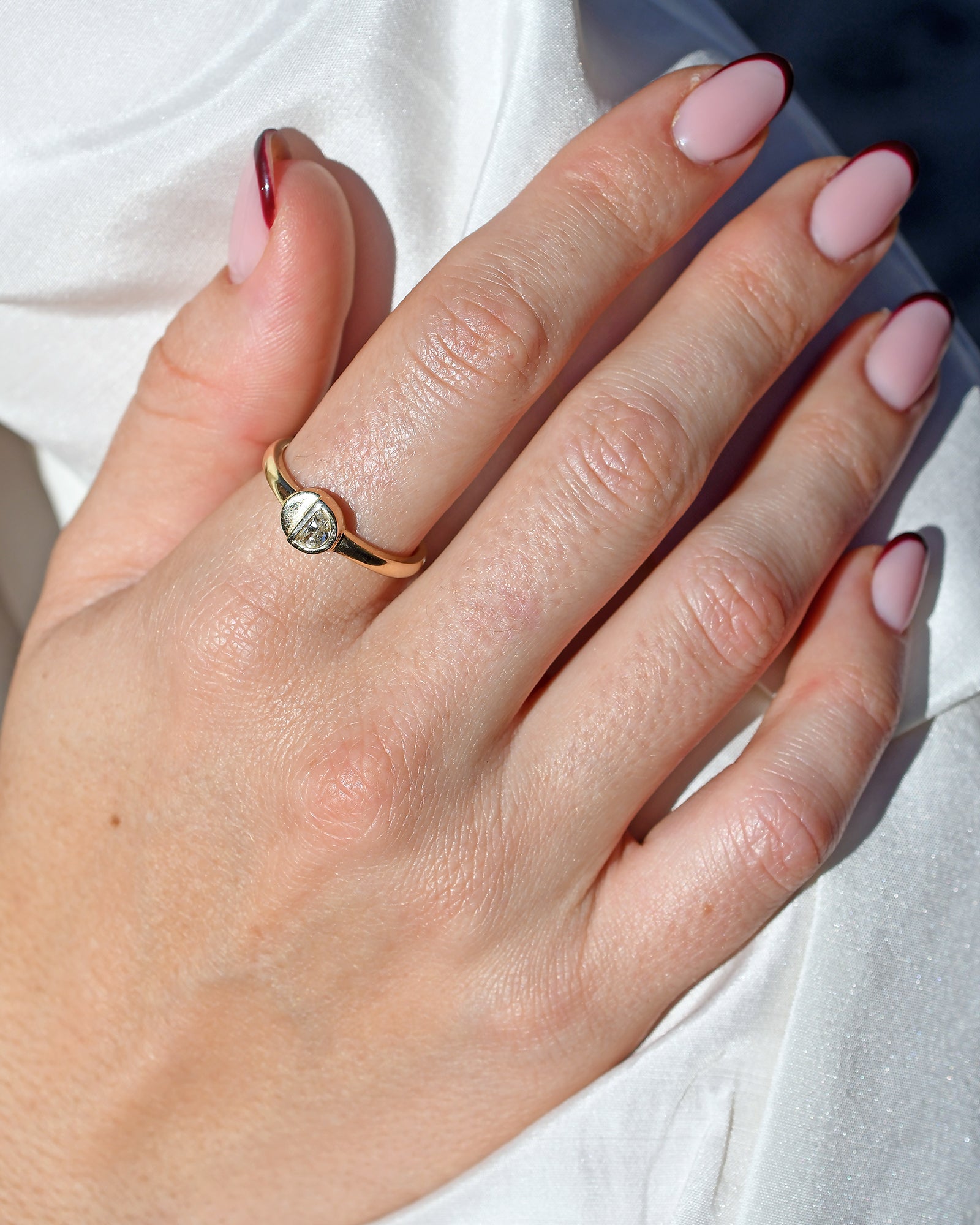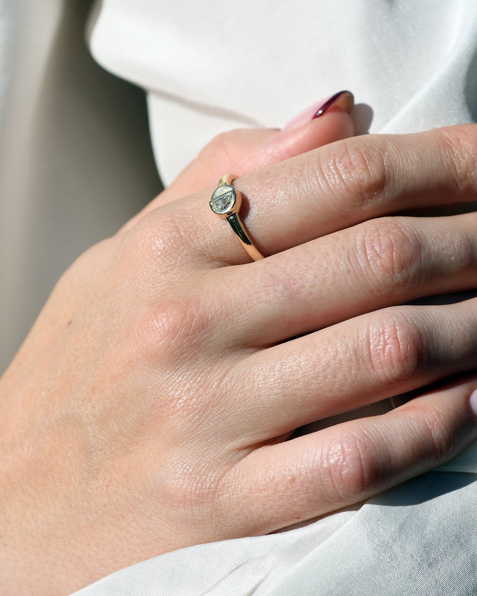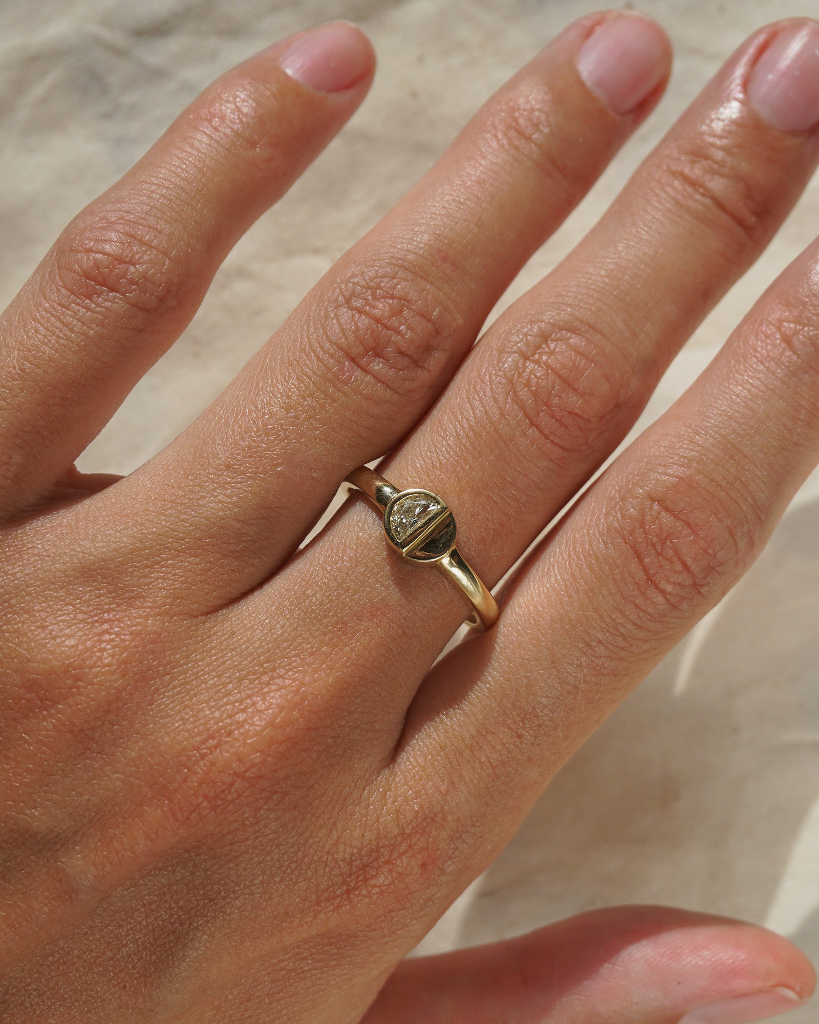 Designed for the starry-eyed and celestial admirers, the Moon Shadow Ring elegantlybridges the cosmos to your fingertips. Its round sleek gold setting cradles an enchanting singular white diamond, evoking the mysterious charm of a lunar eclipse.