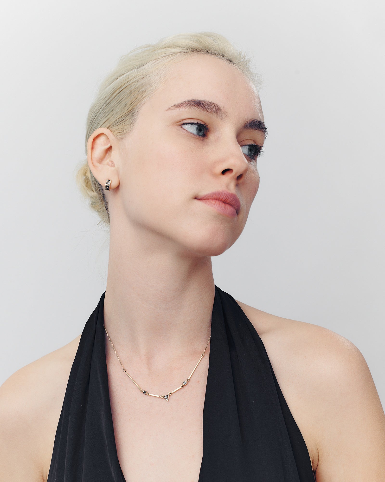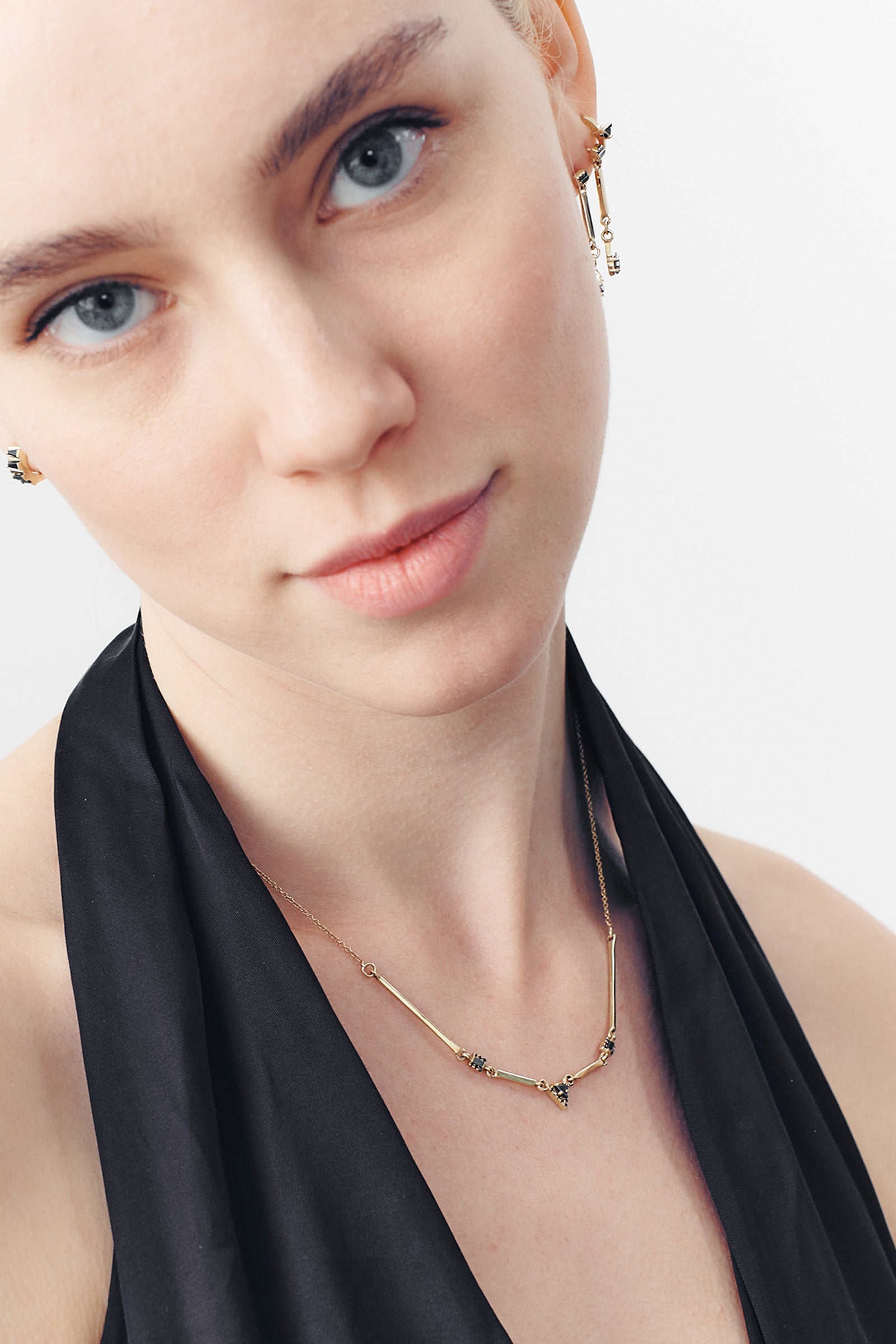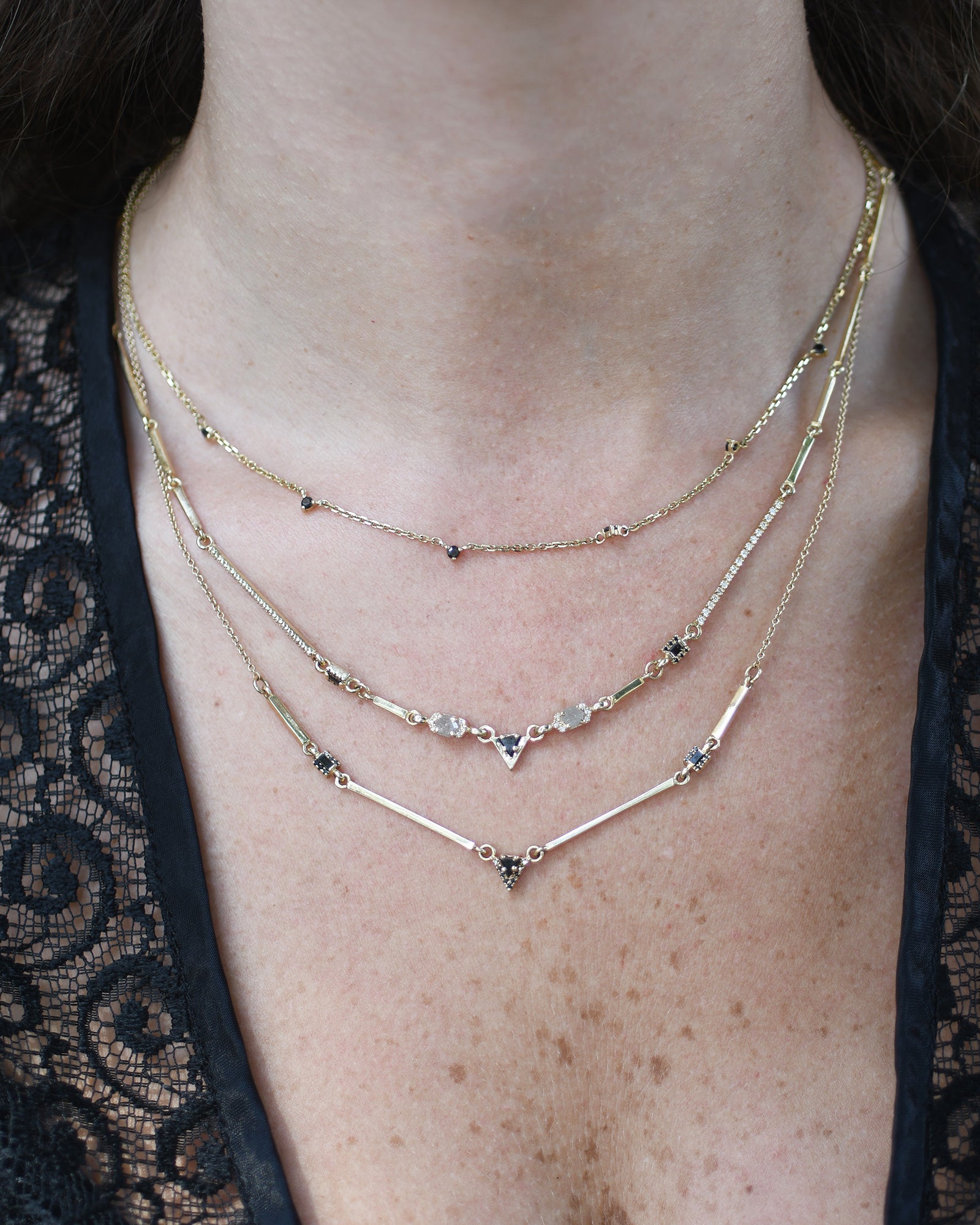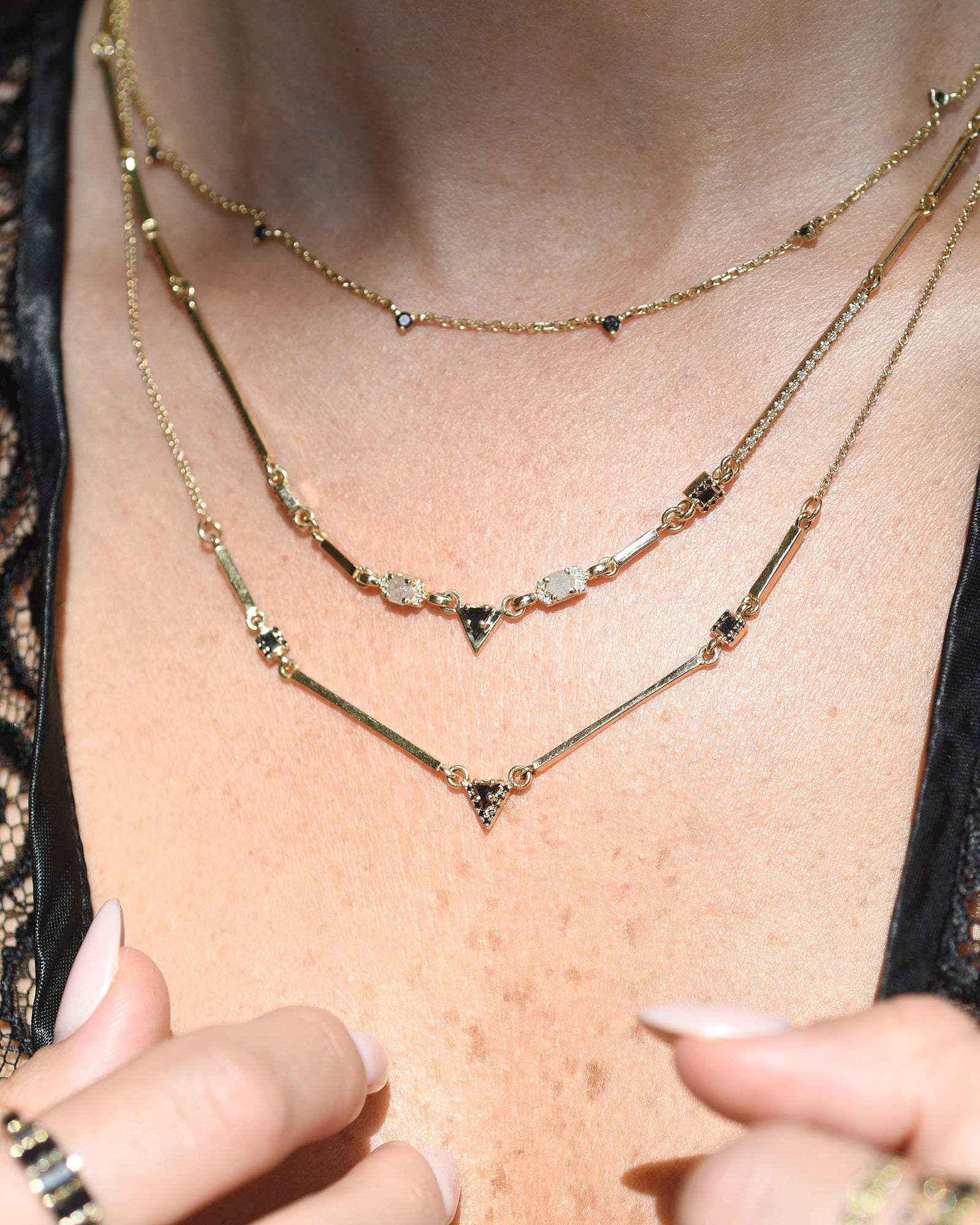 Indulge in the captivating allure of the Nika Black Diamonds Necklace, showcasing mesmerizing black diamonds meticulously set within intricate elements. The central triangle setting highlights a captivating triangular-cut black diamond adorned with delicate sprinkles of black diamonds. The contrast between the rich black diamonds and gleaming gold links creates a stunning harmony of timeless essence and modern sophistication. Let the Nika Necklace be your radiant symbol of empowerment and beauty, a captivating work of art destined to turn heads and evoke admiration.
