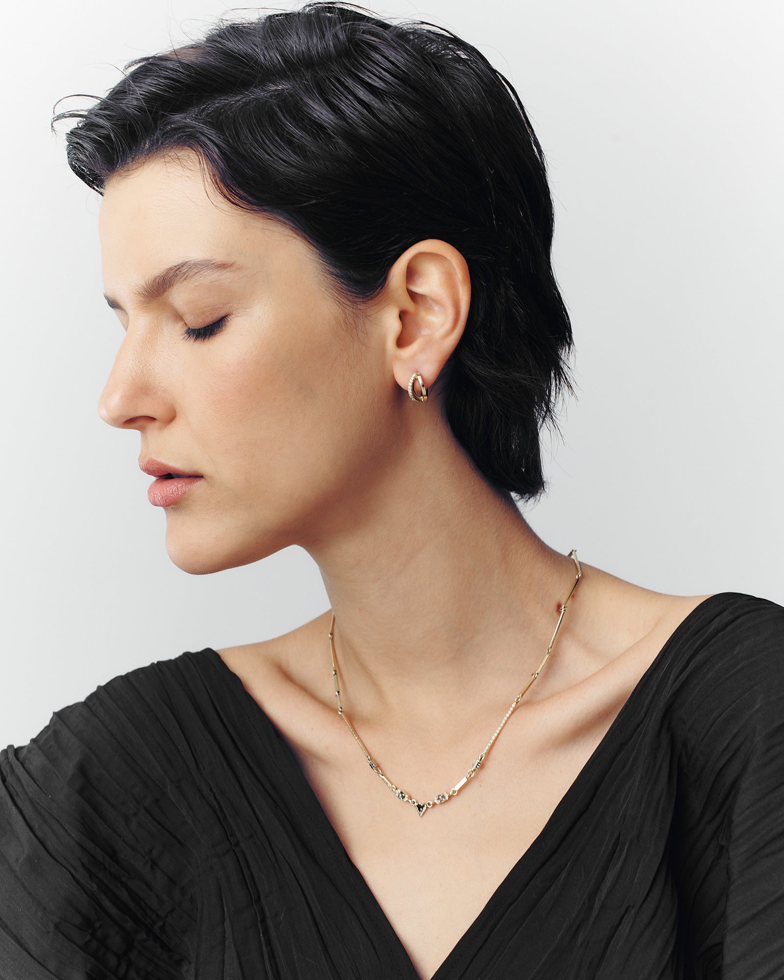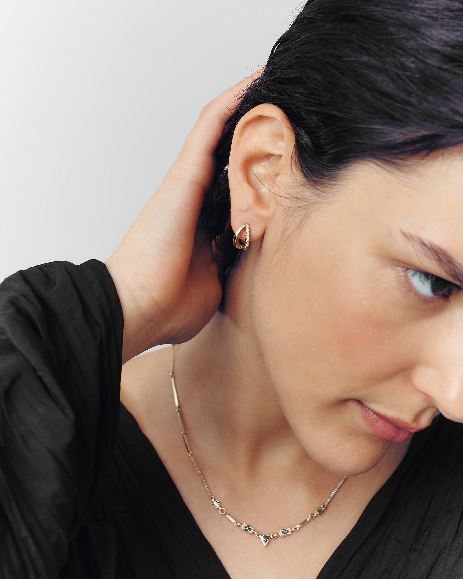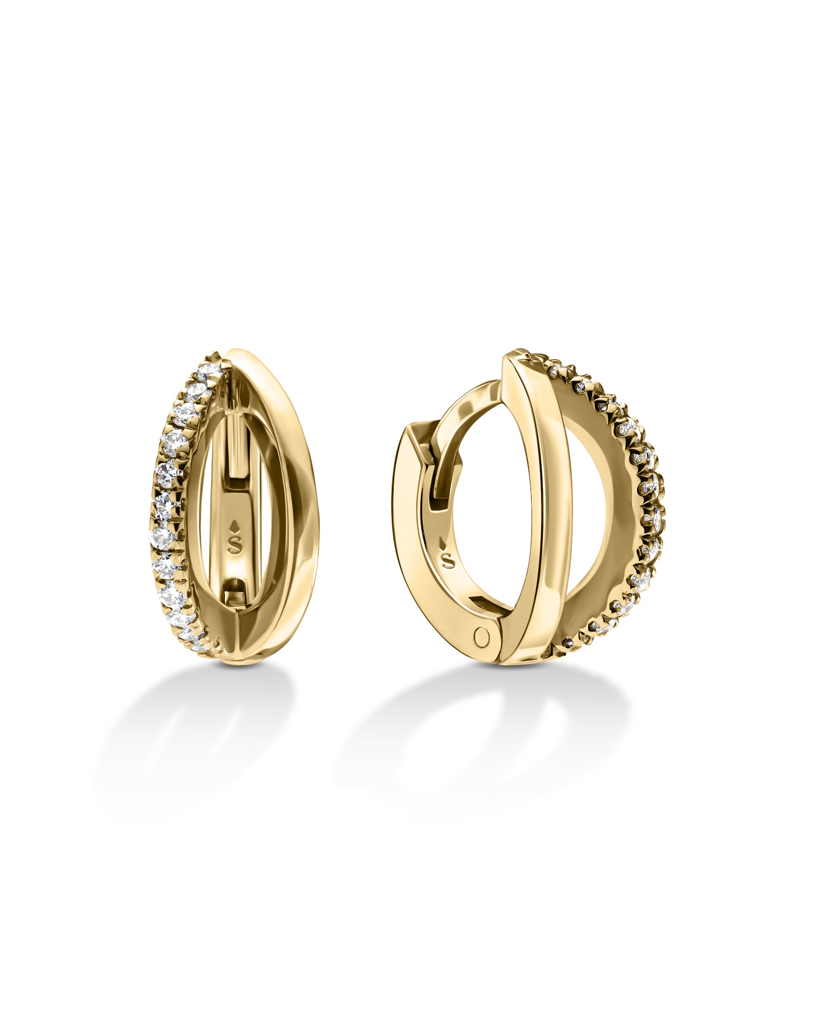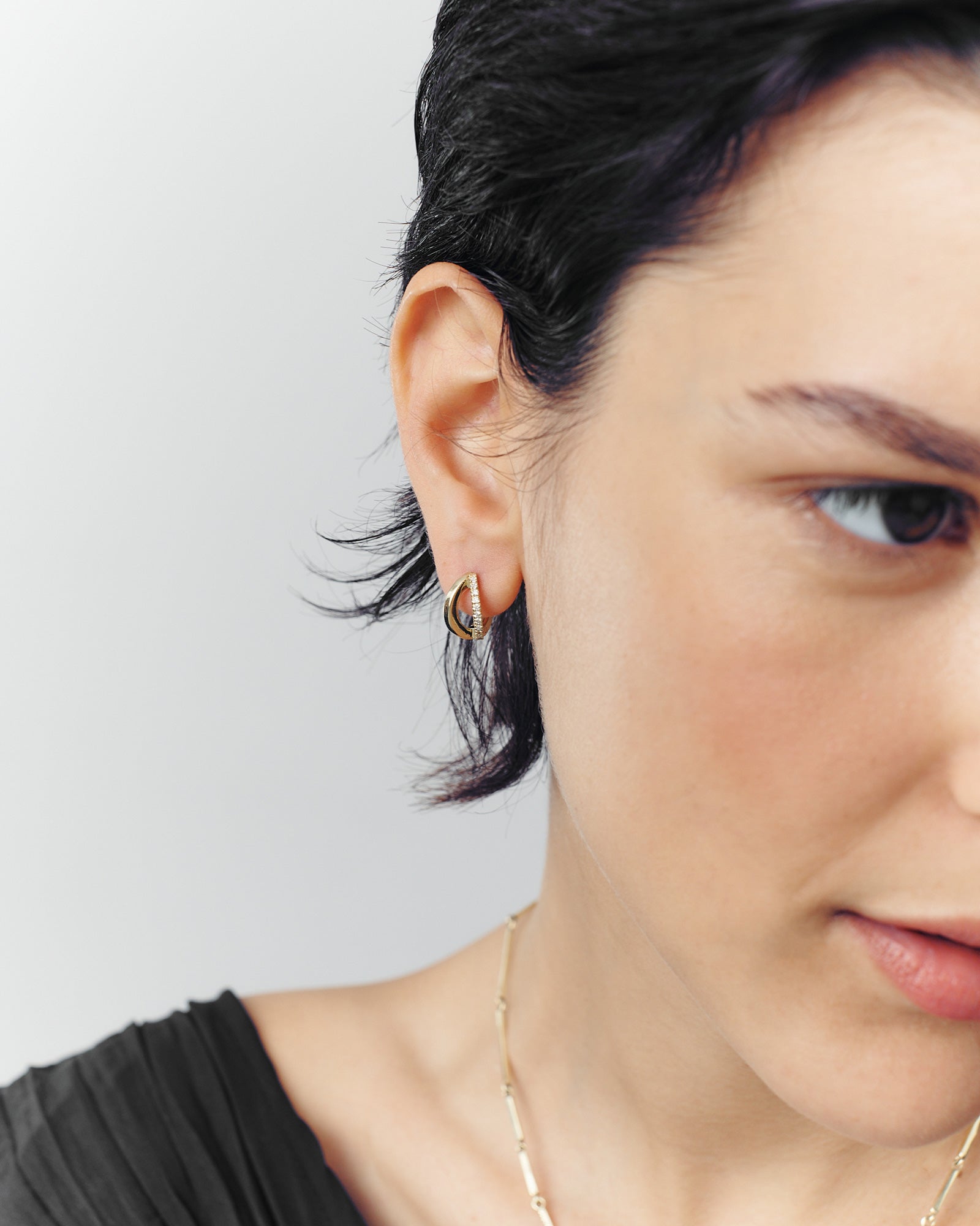 Introducing our Niki White Diamonds hoop earrings. Each earring boasts twelve exquisite diamonds that radiate an unparalleled shine. The unique elements of gold and diamond curves seamlessly integrate to create a truly stunning piece that elegantly embraces your ear with grace and class.