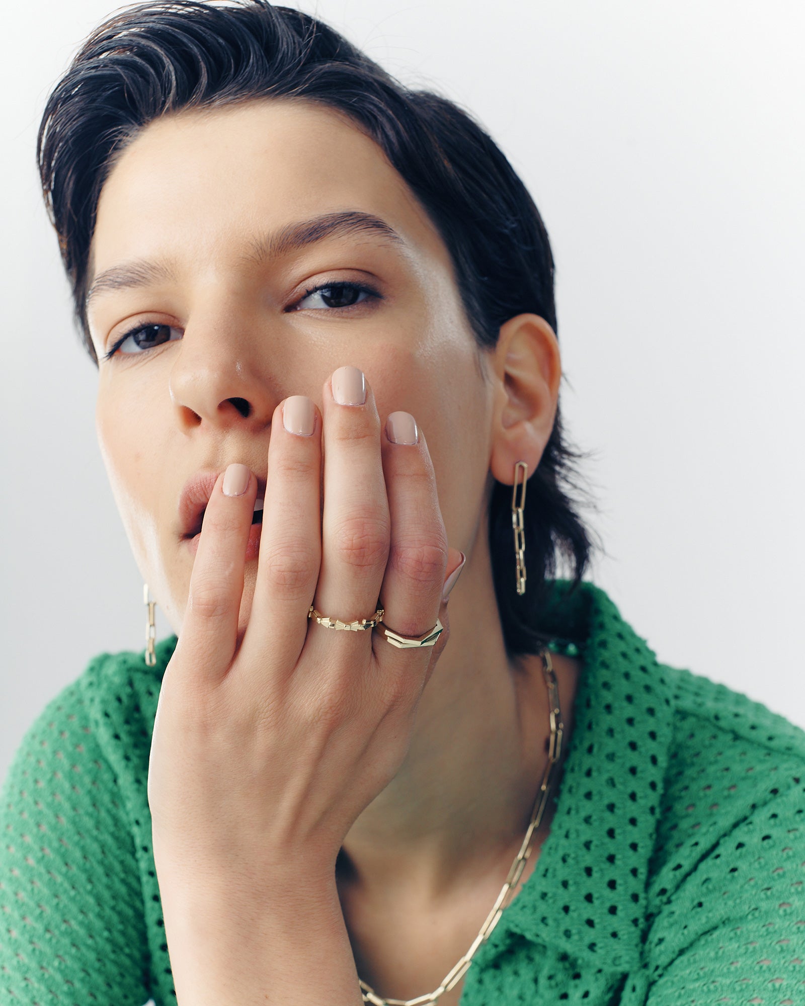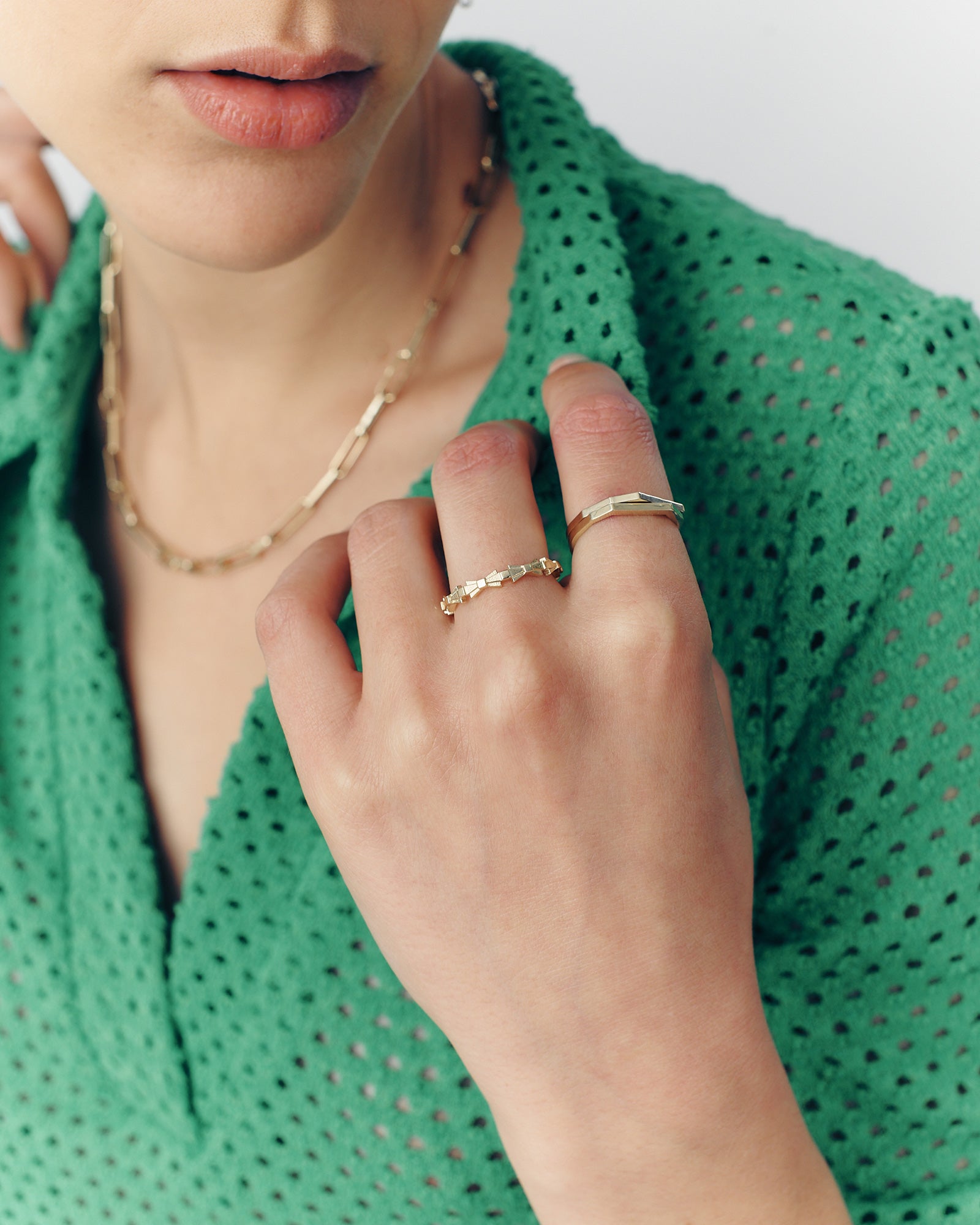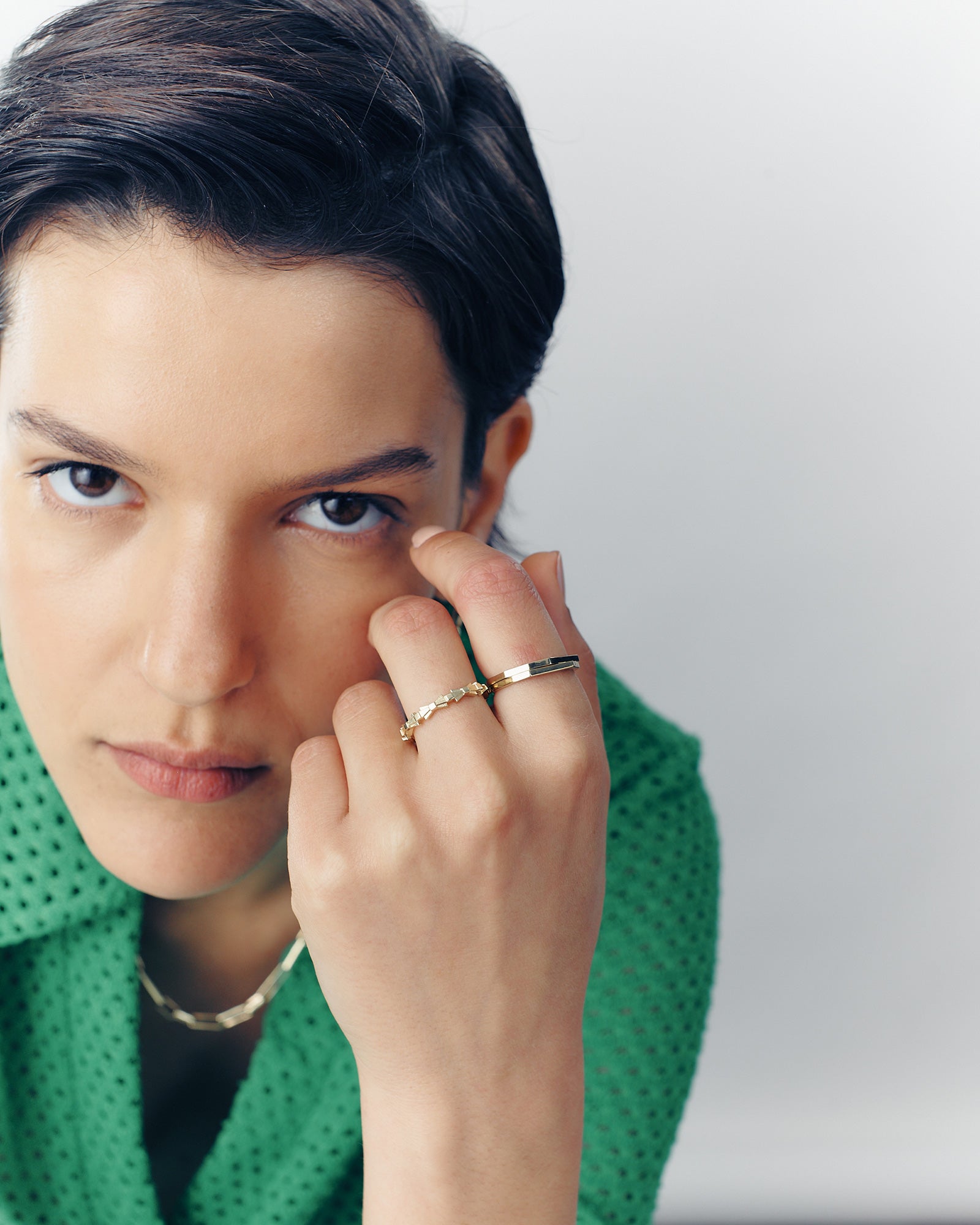 Discover the modern charm of Rio, a delicate gold band ring designed with an eye-catching geometric front. It's sleek and minimalist aesthetic allows it to effortlessly mix and match with other pieces, adding a touch of contemporary flair to any ensemble.