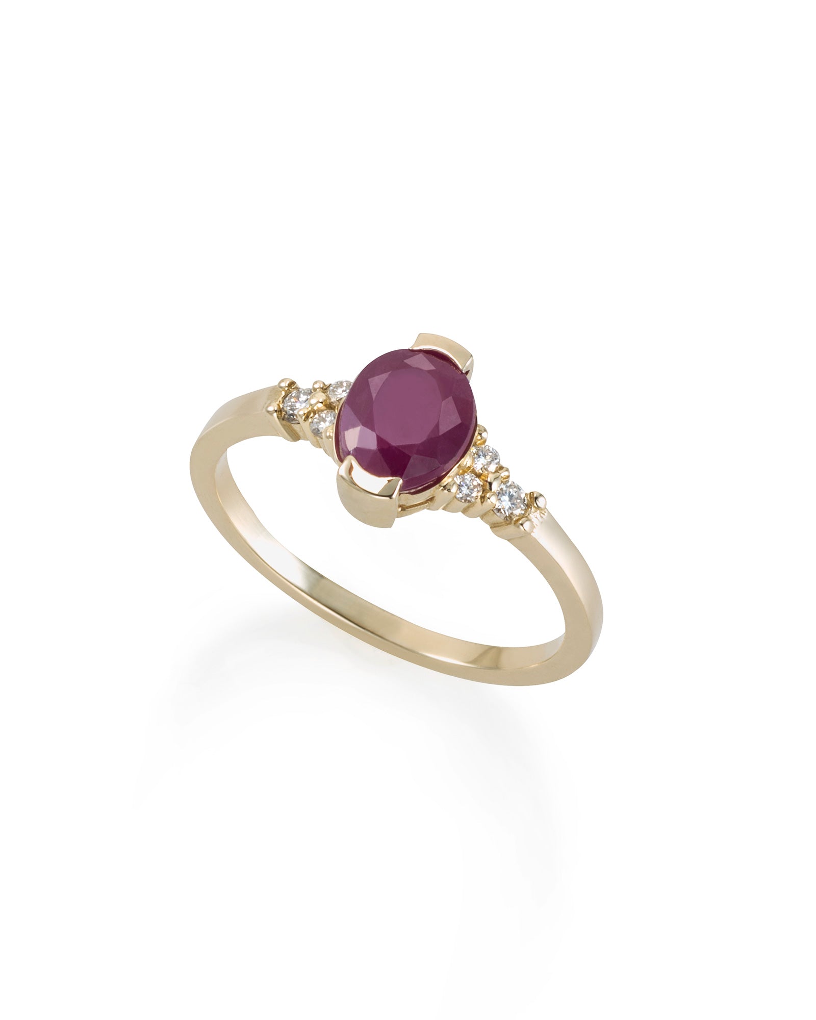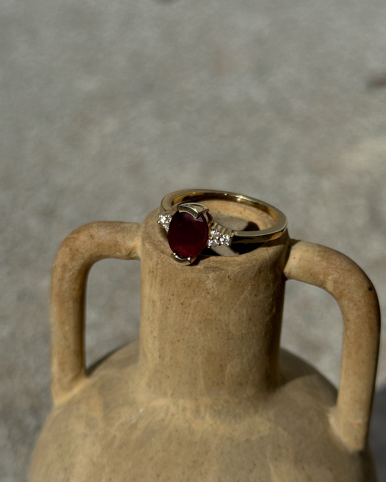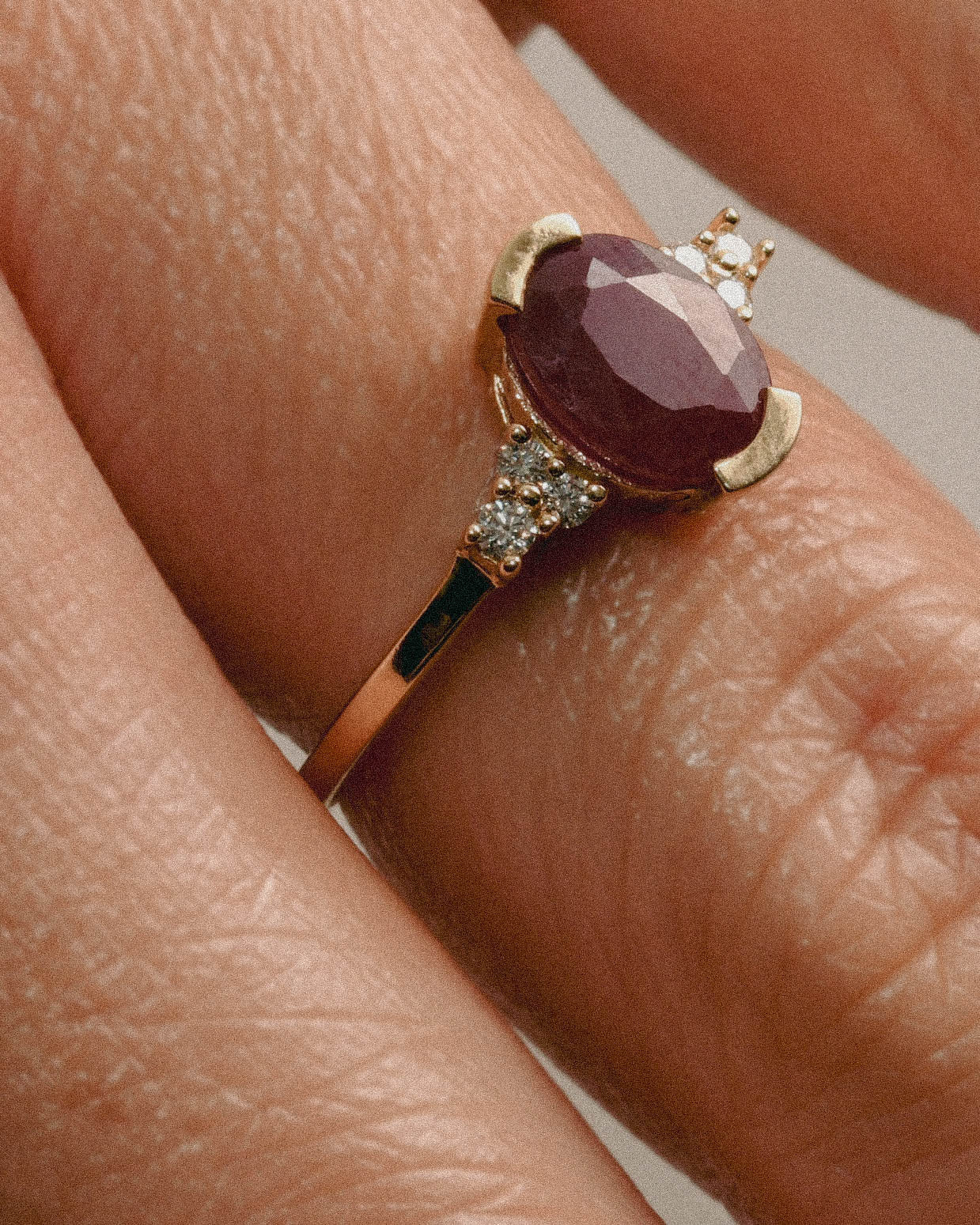 Immerse yourself in the captivating beauty of our Rose ring. With its centerpiece, a grand natural ruby gem commanding attention and admiration, and delicate white diamonds gracefully adorning its sides, this exquisite ring is designed to captivate hearts and ignite passion.