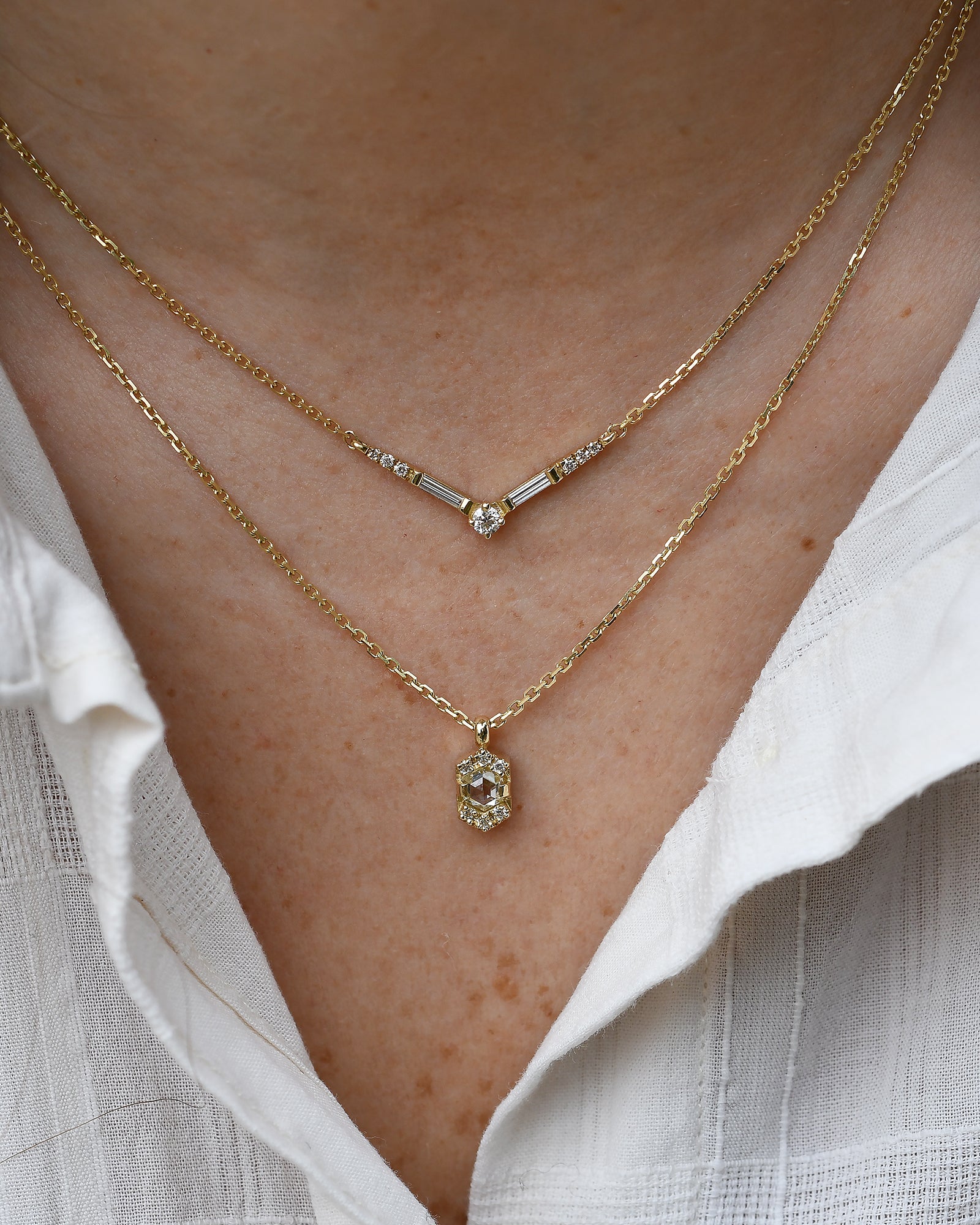 In the Sigma Necklace, gray and white diamonds unite, forming a canvas of enchantingshades and pure brilliance. Embrace the artistry woven into each delicate detail, and wear this exquisite creation as your unique interpretation of a timeless classic.