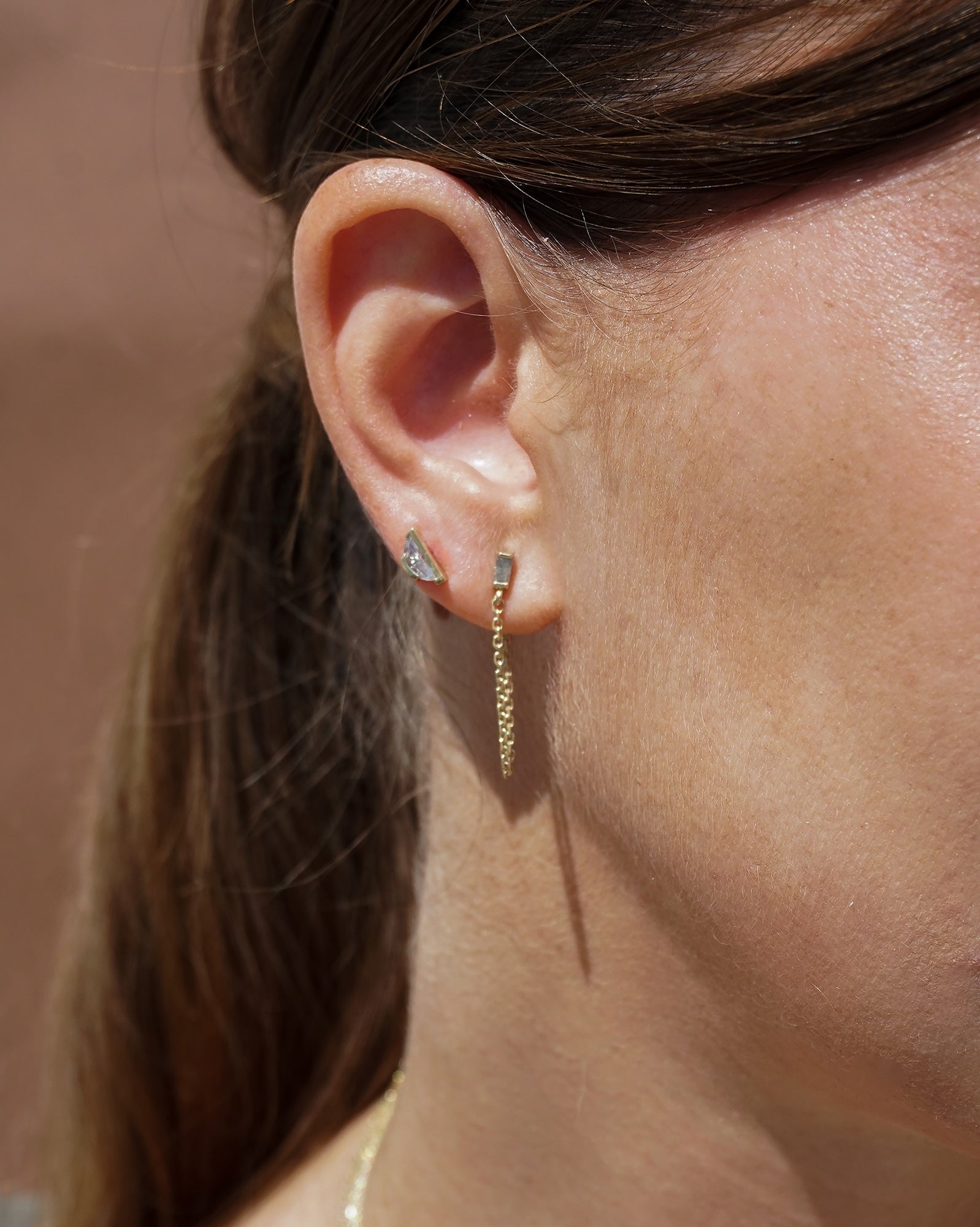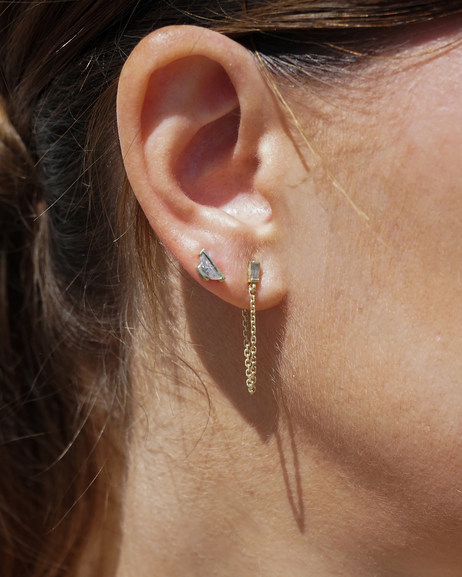 The Wendy earrings harmoniously blend style and practicality with a delicate gourmet chain and a striking baguette-cut gray diamond, making them an impeccable choice for those seeking for a versatile earring that seamlessly integrates into their daily routine without compromising on design.